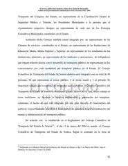 El servicio público de transporte urbano de la ciudad de Hermosillo: Análisis de los procedimientos administrativos de la concesión 1982 - 2004 Transporte del Congreso del Estado, un representante de la Coordinación Estatal de Seguridad Pública y Tránsito, los Presidentes Municipales o la persona que el Ayuntamiento respectivo designe, un representante de cada uno de los Consejos Consultivos Municipales constituidos en el Estado. Asimismo dicho Consejo también estará integrado por: un representante de las Cámaras de servicios constituidas en el Estado, un representante de las Instituciones de Educación Media, Media Superior y Superior, un representante de los estudiantes de las instituciones anteriores, un representante de los sindicatos y asociaciones de trabajadores que tengan relación directa con el desarrollo del transporte público, un representante de los concesionarios por cada modalidad del transporte público en el Estado. El Consejo Consultivo de Transporte del Estado de Sonora debería estar integrado con un total de 96 personas, 90 que representan al sector público, 3 al sector social y 3 al privado. Es importante señalar que la cantidad de integrantes que conforman el Consejo Consultivo del Transporte del Estado de Sonora es demasiado grande, motivo por el cual, dicho consejo se torna ineficiente, no favorece la efectiva deliberación y planeación del transporte. Asimismo, el hecho de que esté integrado por una gran mayoría de funcionarios del gobierno (específicamente presidentes municipales) no garantiza la profesionalización del manejo y administración del transporte público. De acuerdo con lo establecido en el Reglamento del Consejo Consultivo de 28 Transporte del Estado de Sonora , el día 11 de marzo del 2004 se instala el Consejo Consultivo de Transporte del Estado de Sonora. Según lo asentado en la Acta de 28 Publicado en el Boletín Oficial del Gobierno del Estado de Sonora el día 1 de Marzo del 2004, bajo el Número 18, Sección I, Tomo CLXXIII 92
