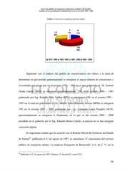 El servicio público de transporte urbano de la ciudad de Hermosillo: Análisis de los procedimientos administrativos de la concesión 1982 - 2004 Gráfica 1. Concesiones otorgadas por periodos legales. 0 57 117 0% 14% 28% 242 58% 1973 -1982 1983 -1992 1993 - 2002 2003 - 2005 Siguiendo con el análisis del padrón de concesionarios nos dimos a la tarea de determinar en qué periodo gubernamental se otorgaron el mayor número de concesiones y el resultado nos arroja que en el sexenio 1976 – 1985 en el que gobernaba el Dr. Samuel Ocaña García (SOG) se otorgaron aproximadamente 128; en el sexenio 1985 – 1991 gobernado por Ing. Rodolfo Félix Valdez (RFV) se autorizaron 100; en el sexenio 1991 – 1997 en el cual era gobernador el Lic. Manlio Fabio Beltrones Rivera (MFB) se otorgaron 159; en el sexenio 1997 – 2003 gobernado por Lic. Armando López Nogales (ALN), aproximadamente se otorgaron 6; finalmente, en lo que va del sexenio 2003 – 2009 presidido en el gobierno por el Ing. Eduardo Bours Castelo, al parecer no se han otorgado concesión alguna. Es importante señalar que de acuerdo con el Boletín Oficial del Gobierno del Estado 34 de Sonora , publicado el 21 de agosto de 1997, se cancelaron 27 concesiones del servicio público de transporte urbano. La empresa Transporte de Hermosillo, S.A. de C. V. era la 34 Publicado el 21 de agosto de 1997. Número 15, Sección IV, tomo CLX 96