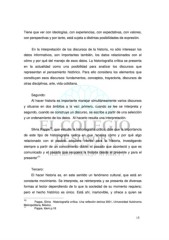 Tiene que ver con ideologías, con experiencias, con expectativas, con valores, con perspectivas y por tanto, está sujeta a distintas posibilidades de expresión. En la interpretación de los discursos de la historia, no sólo interesan los datos informativos, son importantes también, los datos relacionados con el cómo y por qué del manejo de esos datos. La historiografía crítica se presenta en la actualidad como una posibilidad para analizar los discursos que representan el pensamiento histórico. Para ello considera los elementos que constituyen esos discursos: fundamentos, conceptos, trayectoria, discursos de otras disciplinas, arte, vida cotidiana. Segundo: Al hacer historia es importante manejar simultáneamente varios discursos y situarse en dos ámbitos a la vez: primero, cuando se lee se interpreta y segundo, cuando se construye un discurso, se escribe a partir de una selección y un ordenamiento de los datos. Al hacerlo resulta una interpretación. 10 Silvia Pappe , que estudia la historiografía crítica, dice que la importancia de este tipo de historiografía radica en que “analiza cómo y por qué algo relacionado con el pasado adquiere interés para la historia, investigando siempre a partir de un conocimiento doble: el pasado que aconteció y que es comunicado y el pasado que recupera la historia desde el presente y para el 11 presente” Tercero: El hacer historia es, en este sentido un fenómeno cultural, que está en constante movimiento. Se interpreta, se reinterpreta y se presenta de diversas formas al lector dependiendo de lo que la sociedad de su momento requiera; pero el hecho histórico es único. Está ahí, inamovible, y ofrece a quien se 10 Pappe, Silvia Historiografía crítica. Una reflexión teórica 2001, Universidad Autónoma Metropolitana, México. 11 Pappe, Idem p.16 15
