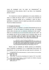 18 manos del investigador como “sus datos” son interpretaciones de interpretaciones de otras personas, sobre lo que ellas y sus compatriotas 19 piensan o sienten En el estudio de la cultura los significantes son los actos simbólicos y la 20 meta es el análisis del discurso social . Si la cultura es ese entramado de procesos y relaciones sociales que se manifiestan a partir de actos y significados, es necesario conocer la relación que existe entre sus elementos. Para ello se hablará de estructura. 1.2. Conceptos de estructura Una estructura implica, por definición, una relación entre elementos que son sus 21 subsistemas , se trata del sistema de relaciones que rigen una sociedad. 22 Sahlins define estructura como: las relaciones simbólicas del orden cultural . 23 Habla de una existencia dual en las interacciones dentro de dicho orden , de una existencia dual del acto del individuo que se encuentra dentro de una sociedad. La sociedad plantea de cierta forma el acto realizado, y dicho acto individual influye en el mantenimiento o en la variación de las estructuras. El problema se centra en las relaciones entre las formas sociales y los actos adecuados. Planteo la posibilidad, que rara vez parece tomarse en cuenta, de que esas relaciones sean reversibles: que los tipos de 24 actos habituales puedan precipitar formas sociales y viceversa . Muchos actos son realizados por decisión personal, por sentimientos, como el matrimonio, el pertenecer o no a un determinado círculo social o de especialización, sin que eso quiera decir que están fuera de la estructura. El 18 La interpretación como actividad participativa, en donde se observa la forma de pensar de quien interpreta un hecho. 19 Geertz. Ídem p. 24. 20 Geertz. Idem. p. 36. 21 Durand, Gilbert. Las estructuras antropológicas de lo imaginario. 1981; Taurus, Madrid. p.15 22 Sahlins, Marshall Islas de historia. La muerte del capitán Cook. Metáfora, antropología e historia 1997; Gedisa, 3ª. Edición, Barcelona. p. 9. 23 Amplío el tema más adelante 24 Sahlins, Idem. p.12 19