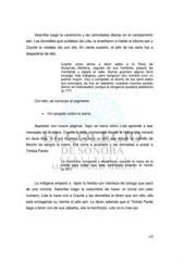 Describe luego la ceremonia y las actividades diarias en el campamento seri. Las doncellas que cuidaban de Lola, la enseñaron a hablar el idioma seri y Coyote la visitaba día con día. En cierta ocasión, el jefe de los seris fue a despedirse de ella: Coyote viene ahora a decir adiós a la Perla de Guaymas...Mañana, seguido de sus hombres, pasará las montañas y bajará al valle. Nunca guerrero alguno llevó encargo más trabajoso...pero tampoco otro hombre tuvo un premio mayor...Voy a completar el triunfo de los seris sobre sus enemigos; de hoy en adelante, nuestros muertos podrán dormir sin sobresaltos, porque la venganza quedará satisfecha (p.177) Con ello, se concluye el segmento. • Un cangrejo sobre la arena Apartado con nueve páginas. Aquí se narra cómo Lola aprende a leer mensajes en la arena. Coyote le deja un mensaje donde le indica que volverá en doce días. Al ir por la playa, Lola ve a un niño que al pulir un colmillo de tiburón se sangra la mano. Ella corre a auxiliarlo y las doncellas a avisar a Tórtola Parda: La hechicera, arrogante y desdeñosa, sacudió la mano de la criolla para evitar que ésta continuara tocando al herido (p.181) La indígena empezó a tapar la herida con manteca de tortuga que sacó de una concha. Describe luego la costumbre de hacer un torzal con pelo humano, Lola le hace uno a Coyote y las doncellas le dicen que con ello, ella está entregando su vientre al jefe seri. Le dicen además que si Tórtola Parda llega a tener uno de sus cabellos, ella la hechizará. Lola no lo cree así. 197