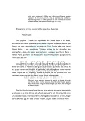 vivir entre los suyos [...] Ellos son indios como Coyote, porque nacieron de mi amor por él... más si los hijos no existieran, Iguana seguiría a su señor, porque es sólo sombra del cuerpo que encierra el más tierno corazón (pp.251-252) El segmento termina cuando la tribu abandona Guaymas. • Pozo Coyote Diez páginas. Cuando los seguidores de Coyote llegan a su aldea, encuentran sus casas quemadas y saqueadas. Algunos indígenas piensan que fueron los yoris, aprovechando su ausencia. Pero Coyote sabe que fueron Huevo Zaino y sus seguidores. Totoaba, amiga de las doncellas que acompañan a Lola, dice saber quienes fueron y asegura que Huevo Zaino y Tórtola Parda quemaron las chozas como escarmiento para los que pisaron la “tierra seca del yori”. Los guerreros muestran su enojo y Coyote decide ir en su búsqueda sin tomar en cuenta la insistencia de Iguana que le decía que todas las armas de su grupo habían sido robadas o quemadas, que se esperara hasta elaborar otras. Coyote se va, molesto y vuelve en brazos de sus hombres con una herida en el pecho y casi sin aliento, como última voluntad pide: Marchen tierra adentro, busquen la lejanía en donde el coraje de Huevo Zaino no los alcance...Cuando otro Coyote Iguana haya madurado, venguen esta sangre que ahora me corre por el pecho (p.261) Cuando Coyote muere luego de una larga agonía, su cuerpo es envuelto y colocado en la cima del más alto y fuerte sahuaro “el sol [lo] consumirá como un preciado manjar, mientras el ánima ha llegado al corazón de la tierra, hogar de los difuntos” (pp.261-262) En esta versión, Coyote recibe honores al morir. 205