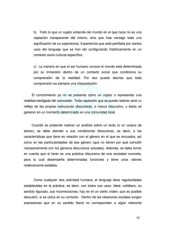 b) Todo lo que un sujeto entiende del mundo en el que nace no es una captación transparente del mismo, sino que trae consigo toda una significación de su experiencia. Experiencia que está perfilada por ciertos usos del lenguaje que se han ido configurando históricamente en un contexto socio-cultural específico. c) La manera en que el ser humano conoce el mundo está determinada por su inmersión dentro de un contexto social que condiciona su comprensión de la realidad. Por eso puede decirse que toda comprensión es siempre una interpretación. El conocimiento ya no se presenta como un copiar o representar una realidad desligada del conocedor. Toda captación que se pueda realizar será un reflejo de las propias estructuras discursivas, o marco discursivo, y éstas se generan en un momento determinado en una comunidad local. Cuando se pretende realizar un análisis sobre un texto (o un corpus de textos), se debe atender a sus condiciones discursivas, es decir, a las características que tiene en relación con el género en el que se encuadra, así como en las particularidades de ese género (que no tienen por qué coincidir necesariamente con los géneros discursivos actuales). Además, se debe tomar en cuenta que el texto es una práctica discursiva de una sociedad concreta, para la cual desempeña determinadas funciones y tiene unos valores relativamente estables. Como cualquier otra actividad humana, el lenguaje tiene regularidades establecidas en la práctica, es decir, con todos sus usos: ideal, cotidiano, su sentido figurado, sus incorrecciones; hay en él un cierto orden, que es posible descubrir, si se ubica en su contexto. Dentro de las relaciones sociales surgen expresiones que en su sentido literal no corresponden a algún referente 30