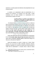 experiencia. La narrativa puede tomar diferentes rumbos dependiendo de lo que se quiere transmitir. La narrativa, es la representación verbal de acontecimientos. Es un simulacro de la estructura y los procesos de los actos reales. Y puede considerarse como una historia verdadera si su representación de los acontecimientos se apega a los mismos. La historia contada en la narrativa es una mimesis de la historia vivida en alguna región de la realidad histórica, y en la medida en que constituye una imitación precisa, ha de 57 considerarse una descripción fidedigna. En el discurso histórico, la narrativa sirve para convertir en un relato una lista de acontecimientos históricos que de otro modo serían sólo una crónica. Para conseguirlo, estos acontecimientos deben ser codificados como elementos de un relato de un tipo específico, es decir, los agentes serán los típicos que requiere la estructura del relato, los hechos deben coincidir también con dicha estructura, y ésta estructura debe seguir un trama cultivado por una determinada cultura. Sin embargo, hay también elementos estructurales que toda narrativa debe tener: un inicio, un tema central y un cierre. Hayden White afirma que el valor de la narratividad para la representación de los acontecimientos reales “surge del deseo de que los acontecimientos reales revelen la coherencia, integridad, plenitud y cierre de una imagen de la 58 vida que es y sólo puede ser imaginaria” Desde esta perspectiva, los hechos no hablan por sí mismos. Deben encontrar una voz que les de unidad, continuidad, coherencia, estructura, perspectiva y significado. Es a través de la narrativa que la historia encuentra el modelo ideal de representación. La narración ofrece el efecto de rellenar 57 White, Hayden. El contenido de la forma. Narrativa, discurso y representación histórica. 1992: Paidós Básica, Barcelona. pp. 42-43 58 White, Hayden. El contenido de la forma. Idem. p 38 34