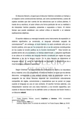 El discurso literario, al igual que el discurso histórico considera un tiempo y un espacio como construcciones teóricas, así como acontecimientos y actos de sujetos sociales que dan cuenta de las estructuras que la cultura plantea. A través de su escritura, el autor ofrece una forma particular de ver su realidad o de interpretar hechos pasados, presentes o supuestos a futuro. Al mismo tiempo que puede establecer una actitud crítica al describir o al redactar explicaciones objetivas. El escritor elabora su mensaje tomando como instrumento de expresión un sistema significativo ya construido, el lenguaje articulado cargado de 75 connotaciones , sin embargo, el texto literario no está constituido sólo por su función poética, sino que es “la conjunción de un as de vectores constituyentes 76 en los cuales la función poética es la función dominante” . Esta función es posible dentro de una sociedad y un tiempo determinado y adquiere significado si se ubica en el contexto del lenguaje literario constituido por reglas de juego diferentes a las de la lengua común. En la obra literaria se distorsiona el lenguaje natural a partir de mecanismos de expresión: la distorsión se da a nivel fonológico, sintáctico, semántico. 77 Según Greimas la especificidad de la literatura no atañe a la naturaleza de su material, sino a su pragmática. El discurso literario, al igual que los demás discursos, corresponde a una actitud cultural: tanto la producción como la recepción de las obras literarias depende del conocimiento culturalmente compartido de reglas, convenciones y expectativas que se ponen en juego cuando el lenguaje se usa en ese contexto. El escritor formula además, una interpretación racional con una clara intención y una función específica, aún cuando el discurso literario se ha definido como un discurso de ficción frente a un discurso natural. 75 Prada Oropeza, Renato. (coord.) Lingüística y Literatura. 1978; Universidad Veracruzana; Xalapa 76 Prada Oropeza, Idem. p. 7 77 Greimas, Algidas Julien “El contrato de veridicción” en Prada Oropeza. Ídem. pp. 28-29 44
