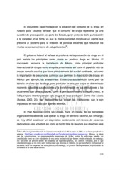 El documento hace hincapié en la situación del consumo de la droga en nuestro país. Estudios señalan que el consumo de droga representa ya una cuestión de preocupación por parte del Estado, quien pretende darle participación a la sociedad en el tema, ya que la misma sociedad constituye un agente que presiona al gobierno para la creación de políticas eficientes que reduzcan los 59 niveles de consumo interno de estupefacientes . El gobierno federal al señalar el problema de la producción de droga en el país señala las principales zonas donde se produce droga en México. El documento reconoce la importancia de México como principal productor internacional de drogas como amapola y marihuana, así como el papel de ruta de drogas como la cocaína que viene principalmente del sur del continente, así como la importación de precursores químicos que permiten la elaboración de drogas en México (por ejemplo, las anfetaminas). Existe una autodefinición como país de tránsito en cierto tipo de droga, pero productor en otra; por lo que en determinado momento subordina sus decisiones y la transformación de sus instituciones a los dictámenes que otros jugadores, como la prensa o el mismo Estados Unidos, le indiquen para intentar cambiar esta imagen de “país productor”. Como dice Acosta (Acosta, 2002, 24), hay instituciones que acatan las instituciones que le son impuestas, en este caso, por agentes externos. El Plan Nacional contra las Drogas, hace un repaso de las principales organizaciones delictivas que operan la droga en territorio nacional, sin embargo, es muy difícil establecer un diagnóstico contundente del número de personas dedicadas a esta actividad, así como el monto total de recursos que disponen para 59 Para ello, la siguiente dirección de internet, consultada el día 30 de junio de 2005, es un buen ejemplo de lo anterior. http://www.conadic.gob.mx/fileinclude.asp?inc=doctos/consolidar_sistemas.raw. Hemos de decir que las organizaciones no gubernamentales encargadas de luchar contra las adicciones pueden ser consideradas como un actor más dentro de esta arena institucional que hemos venido relatando, sin embargo, sus funciones de presión dentro del esquema de seguridad pública, nos parecen limitadas, por lo que consideramos que su rol como actor institucional que presiona es mínimo, ya que su esfuerzo institucional se encamina hacia los esquemas de salud pública, sin embargo, no por ello menospreciamos la posibilidad de influencia en la toma de decisiones. 102