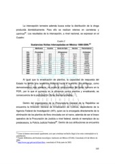 La intercepción terrestre además busca evitar la distribución de la droga producida domésticamente. Para ello se realizan retenes en carreteras y 62 caminos . Los resultados de la intercepción, a nivel nacional, se expresan en el Cuadro: Cuadro 2 63 Sustancias Ilícitas interceptadas en México 1990-2000. Marihuana Cocaína Goma de Opio Heroína Psicotrópicos Año (Toneladas) (Kilogramos) (Unidades) 1990 594.8 49.9 208.9 212.0 554909 1991 255.0 50.3 95.2 146.4 92269 1992 404.6 38.8 167.3 96.8 36298 1993 494.7 46.2 128.8 61.7 15723 1994 529.8 22.1 149.2 297.5 46685 1995 780.2 22.2 222.9 203.2 569789 1996 1015.8 23.8 196.4 363.5 1108863 1997 1038.5 35.0 342.8 114.9 117104 1998 1062.1 22.6 149.6 120.9 1484078 1999 1472.0 34.6 801.2 260.2 1490152 2000 2050.4 23.2 469.5 299.1 3418369 Al igual que la erradicación de plantíos, la capacidad de respuesta del Estado ha tenido una tendencia histórica hacia el aumento. Sin embargo, como demostraremos más adelante, no existe el reforzamiento del factor humano en la PGR., por lo que el aumento en la eficiencia contra plantíos y erradicando, es consecuencia de la participación de las fuerzas armadas. Dentro del organigrama de la Procuraduría General de la República se encuentra la Dirección General de Erradicación de Cultivos, dependiente de la Agencia Federal de Investigación (AFI), quien es la encargada directamente de la eliminación de los plantíos de flora vinculada con el narco, además de ser el brazo operativo de la Procuración de Justicia a nivel federal, siendo el reemplazo de su 64 predecesora, la Policía Judicial Federal . Dentro de sus atribuciones se encuentra 62 Como lo hemos mencionado igualmente, acto que constituye un hecho ilegal al no estar contemplado en la constitución. 63 Fuente: Bibliotreca del Instituto tecnológico Autónomo de México (ITAM). Consultado el 6 de febrero de 2006. 64 http://www.pgr.gob.mx/afi/prof.htm, consultada el 30 de junio de 2005. 105