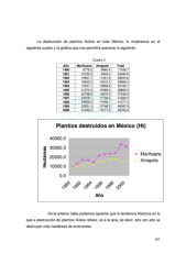 La destrucción de plantíos ilícitos en todo México, lo mostramos en el siguiente cuadro y la gráfica que nos permitirá aseverar lo siguiente: Cuadro 3 Año Marihuana Amapola Total 1990 8778.2 8660.4 17438.7 1991 12702.3 9342.4 22044.6 1992 16801.7 11221.8 28023.6 1993 16645.2 13015.2 29660.4 1994 14207.1 10958.6 25165.7 1995 21573.3 15389.2 36962.5 1996 22768.6 14670.9 37439.4 1997 23576.1 17732.2 41308.3 1998 23928.3 17449.1 41377.4 1999 33351.3 15746.5 49097.9 2000 31046.5 15717.5 46763.9 Plantíos destruidos en México (Ht) 40000.0 30000.0 Hectáreas 20000.0 Marihuana Amapola 10000.0 0.0 1990 1992 1994 1996 1998 2000 Año De la anterior tabla podemos apreciar que la tendencia histórica en lo que a destrucción de plantíos ilícitos refiere, es a la alza, es decir, año con año se destruyen más hectáreas de enervantes. 107
