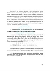Ahora bien, lo que merece un apunte es el hecho de que por un lado, el Estado mexicano aumenta su capacidad de destrucción de plantíos, sin embargo, cuando analicemos más adelante el recurso humano de la PGR, veremos que esta organización tuvo una tenencia hacia la disminución de efectivo, por lo que estamos en posibilidad de afirmar que la capacidad de erradicar plantíos en México no depende de la organización gubernamental que legalmente persigue los delitos (El Ministerio Público Federal, la PGR), sino a la participación de los actores que a lo largo del tiempo se han integrado a la arena institucional, que en este caso, es el Ejército y la Marina Nacionales. 3.4 CONSECUENCIAS POLÍTICAS Y SOCIALES DEL NARCOTRÁFICO EN MÉXICO TRADUCIDAS COMO ENTORNO INSTITUCIONAL Lo cierto es que existen diferentes tipos de consecuencias por este tipo de delincuencia en México. Esto moldea el entorno por el cual otros actores institucionales deben regirse para la toma de sus decisiones, modificando, igualmente, la interacción entre ellos mismos, sea como tomadores de decisiones o como presionadores a los primeros. 3.4.1 CORRUPCIÓN La corrupción genera la creación de un Estado paralelo, una autoridad ilícita en el seno del Estado nación. Regido por sus propias reglas, la corrupción genera: “…la falta de operacionalidad de los mecanismos diseñados para verificar la legalidad de los actos del poder público, resquebrajando las reglas del juego democrático” (Carbonell, 1999: 29). 108