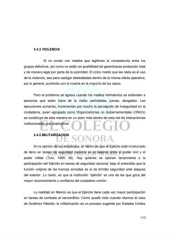 3.4.3 VIOLENCIA Al no contar con medios que legitimen la competencia entre los grupos delictivos, así como no están en posibilidad de garantizarse protección total y de manera legal por parte de la autoridad. El único medio que les resta es el uso de la violencia, sea para castigar deslealtades dentro de la misma célula operativa, por lo general, puniendo con la muerte en la mayoría de los casos. Pero el problema se agrava cuando los medios intimatorios se extienden a personas que están fuera de la mafia: periodistas, jueces, abogados. Las ejecuciones sumarias, incrementan por mucho la percepción de inseguridad en la ciudadanía, quien agrupada como Organizaciones no Gubernamentales (ONG’s) se constituye de esta manera en un actor más dentro de esta red de interacciones institucionales que analizamos. 3.4.5 MILITARIZACION En la opinión de los estudiosos, el hecho de que el Ejército esté involucrado de lleno en tareas de seguridad nacional es el balance entre el poder civil y el poder militar (Toro, 1995: 56). Hay quienes se oponen tenazmente a la participación del Ejército en tareas de seguridad nacional, bajo el entendido que la función original de las fuerzas armadas es la de brindar seguridad ante ataques del exterior. Lo cierto, es que la institución “ejército” es una de las que goza del mayor reconocimiento y confianza del ciudadano común. La realidad en México es que el Ejército tiene cada vez mayor participación en tareas de combate al narcotráfico. Como quedó visto cuando citamos al caso de Gutiérrez Rebollo, la militarización es un proceso sugerido por Estados Unidos 110