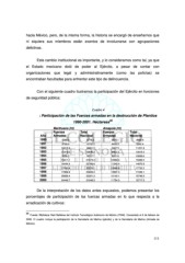 hacia México, pero, de la misma forma, la historia se encargó de enseñarnos que ni siquiera sus miembros están exentos de involucrarse con agrupaciones delictivas. Este cambio institucional es importante, y lo consideramos como tal, ya que el Estado mexicano dotó de poder al Ejército, a pesar de contar con organizaciones que legal y administrativamente (como las policías) se encontraban facultadas para enfrentar este tipo de delincuencia. Con el siguiente cuadro ilustramos la participación del Ejército en funciones de seguridad pública: Cuadro 4 : Participación de las Fuerzas armadas en la destrucción de Plantíos 66 1990-2001. Héctareas Marihuana (ht) Amapola (ht) Fuerzas Total Fuerzas Total Año Armadas Nacional Armadas Nacional 1990 5388.0 8778.2 5975.1 8660.4 1991 8799.9 12702.3 6450.3 9342.4 1992 12215.9 16801.7 7467.5 11221.8 1993 11919.2 16645.2 9083.3 13015.2 1994 8956.5 14207.1 8951.4 10958.6 1995 15811.1 21573.3 12582.4 15389.2 1996 16444.4 22768.6 11249.4 14670.9 1997 17043.4 23576.1 12960.8 17732.2 1998 17806.9 23928.3 12897.3 17449.1 1999 25659.4 33351.3 12140.1 15746.5 2000 24449.7 31046.5 11754.3 15717.5 De la interpretación de los datos antes expuestos, podemos presentar los porcentajes de participación de las fuerzas armadas en lo que respecta a la erradicación de cultivos: 66 Fuente: Biblioteca Raúl Bailléres del Instituto Tecnológico Autónomo de México (ITAM). Consultado el 6 de febrero de 2006. El cuadro incluye la participación de la Secretaría de Marina (ejército) y de la Secretaría de Marina (Armada de México). 111