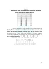Cuadro 5. Participación de las fuerzas armadas en erradicación de cultivos ilícitos (porcentual del esfuerzo nacional) Año Marihuana Amapola 69.0 1990 61.4 69.0 1991 69.3 1992 72.7 66.5 1993 71.6 69.8 1994 63 81.7 1995 73.3 81.8 1996 72.2 76.7 73.1 1997 72.3 73.9 1998 74.4 77.1 1999 76.9 74.8 2000 78.8 Como se aprecia de la lectura del cuadro anterior, la participación del Ejército y Marina en el esfuerzo nacional contra plantíos ilícitos representa, en la mayoría de los casos, porcentajes superiores al 50 del total nacional. Queda demostrado con esto el papel fundamental del Ejército y Marina en la que es considerada por el Estado como la política más exitosa contra el narcotráfico, que es, la erradicación de plantíos. 112