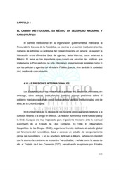 CAPITULO 4 EL CAMBIO INSTITUCIONAL EN MÉXICO EN SEGURIDAD NACIONAL Y NARCOTRÁFICO El cambio institucional en la organización gubernamental mexicana, la Procuraduría General de la República, es referirse a un cambio institucional en las maneras de enfrentar un problema del Estado mexicano en general, ya sea por la interacción entre diferentes tipos de agentes, tanto internos, como externos a México. El tema es tan importante que cuando se estudian las políticas que implementa la Procuraduría, no sólo intervienen organizaciones estatales como lo son las policías o agentes del Ministerio Público, jueces, sino también la sociedad civil, medios de comunicación. 4.1 LAS PRESIONES INTERNACIONALES Los Estados Unidos ha influenciado la política anti narcóticos mexicana, sin embargo, otros actores institucionales también ejercen presiones sobre el gobierno mexicano que traen como consecuencia cambios institucionales, uno de ellos, es la Unión Europea. En Europa había en la década de los noventa preocupaciones relativas a la cuestión relativa a la droga en México. La relación económica entre nuestro país y la Unión Europea era muy importante para el gobierno mexicano ante la eventual suscripción de un Tratado de Libre Comercio. En 1998, El Observatorio Geopolítico de las Drogas (OGD), organismo francés dedicado al estudio global del fenómeno del narcotráfico, daba a conocer un estudio del comportamiento global del narcotráfico, y en su apartado dedicado a México, señala con claridad que la economía mexicana se encuentra “narcotizada”, y señala como la causa de ello al Tratado de Libre Comercio (TLC), narcotización auspiciada por Estados 113