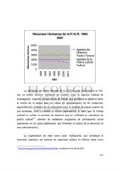 Recursos Humanos de la P.G.R. 1995- 2001 5000 Agentes del Elementos Activos 3000 Ministerio 4000 Público Federal Agentes de la 2000 Policía Judicial 1000 0 Federal 1995 1996 1997 1998 1999 2000 2001 Año La estrategia del militar Macedo de la Concha para reestructurar la PJF, fue, en primer término, cambiarle de nombre: crear la Agencia Federal de Investigación, creando una estructura de mando que permitiera al gobierno tener el control de la policía bajo los rubros de regionalización de los problemas, especializando unidades de la corporación para la multitud de tareas propias de sus funciones, como lo señala la misma dependencia, al decir que “la Policía Judicial ha sufrido un proceso de deterioro que ha nulificado su naturaleza de 77 policía judicial” además de establecer programas de participación social (pensemos en los spots publicitarios que fomentan la cultura de la denuncia en esta administración). La organización de este nuevo actor institucional, que constituye la extensión operativa del sistema de seguridad pública en México tiene como 77 http://www.pgr.gob.mx/afi/AntecedentesAFI.html, consultada el 4 de julio de 2005. 123