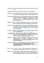 Douglass, Mary . (1986 )How Institutions think. Syracuse University Press. New York. Fernández Menéndez, Jorge, (2001)El otro poder. Nuevo Siglo, México. Fraga Juárez, Raúl. (2002 )Medios de comunicación y cobertura del delito en Los desafíos de la Seguridad Pública en México. México, PGR. Friedland Roger y Robert Alford. (1999 )Introduciendo de Nuevo a la sociedad: símbolos, prácticas y contradicciones institucionales en Powell Walter W y Paul J. DiMaggio Compiladores., El Nuevo Institucionalismo en el análisis organizacional. México, Fondo de Cultura Económica. Gagliardi Pasquale. Traslating Organizational Change, en Administrative Science Quaterly. Marzo de 1999. Academic Research Library. Goldman, Kjell. International relations: an overview. (1998) Political Institutions, Old and New, en A new Handbook of Political Science, editado por Goodin, Robert y Klingemann Hans. Oxford University Press, Gran Bretaña. Graham H. Turbiville. La cambiante postura de seguridad de México. Military review, julio agosto 2001. Immergut, Ellen. M.. (1998 )The rules of the game: The logic of health policy - making in France, Switzerland, and Sweden. En Structuring Politics. Cambridge University Press, Estados Unidos. Jepperson, Ronald L. (1999) Instituciones, efectos institucionales e institucionalismo, en Powell y DiMaggio. El Nuevo Institucionalismo en el análisis organizacional. México, Fondo de Cultura Económica. Kalmanovitz, Salomón. El neo institucionalismo como escuela. Tomado del sitio http://www.banrep.org/junta/publicaciones/salomon/El- neoinstitucionalismo-como-escuelaFinal3.pdf, consultado el 3 de diciembre de 2005. March James y Johan P. Olsen. (1989) Rediscovering institutions. The organization basis of politics, New York, N.Y. The Free Press. Meyer, John W. y Brian Rowan. (1999) Organizaciones institucionalizadas. La estructura formal como mito y ceremonia. Powell Walter W y Paul J. DiMaggio Compiladores., El Nuevo Institucionalismo en 141