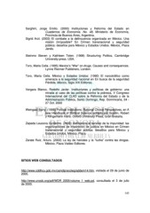 Sarghini, Jorge Emilio. (2000) Instituciones y Reforma del Estado en Cuadernos de Economía. No. 48, Ministerio de Economía, Provincia de Buenos Aires, Argentina. Sigrid Arzt. (2003) El combate a la delincuencia organizada en México. Una misión (im)posible? En Crimen transnacional y seguridad pública: desafíos para México y Estados Unidos. México, Plaza Janés. Steinmo Steven y Kathleen Telen. (1998) Structuring Politics, Cambridge University press. USA. Toro, Maria Celia. (1995) Mexico’s “War” on drugs. Causes and consequences. Lynne Rienner Publishers, London. Toro, Maria Celia. México y Estados Unidos: (1990) El narcotráfico como amenaza a la seguridad nacional en En busca de la seguridad Pérdida. México, Siglo XXI Editores. Vergara Blanco, Rodolfo Javier. Instituciones y políticas de gobierno: una mirada al caso de las políticas contra la pobreza, V Congreso Internacional del CLAD sobre la Reforma del Estado y de la Administración Pública, Santo Domingo, Rep. Dominicana, 24 - 27 Oct. 2000 Weingast Barry. (1998) Political Institutions: Rational Choice Perspectives, en A new Handbook of Political Science, editado por Goodin, Robert y Klingemann Hans. Oxford University Press, Gran Bretaña. Zepeda Leucona Guillermo. (2003) Ineficiencia al servicio de la impunidad: las organizaciones de impartición de justicia en México en Crimen transnacional y seguridad pública: desafíos para México y Estados Unidos. México, Plaza. Zarate Ruiz, Arturo. (2003) La ley de herodes y la “lucha” contra las drogas. México, Plaza Valdez Editores. SITIOS WEB CONSULTADOS http://www.cddhcu.gob.mx/camdip/ecoleg/addem14.htm, visitada el 29 de junio de 2005. http://www.unodc.org/pdf/WDR_2005/volume_1_web.pd, consultada el 3 de julio de 2005. 143
