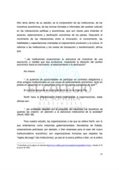 Otro tema dentro de su estudio, es la comprensión de las instituciones, de los incentivos económicos, de las normas formales e informales (de carácter cultural) en las interacciones políticas y económicas, que son claves para entender el ascenso, estancamiento y declinación económica de los países. Descubrió el movimiento de las interacciones entre la innovación, el conocimiento, las habilidades y capacitaciones orientadas al mejoramiento productivo y la cultura. Al referirse a las instituciones y los costos de transacción y transformación, afirma que: "...las instituciones proporcionan la estructura de incentivos de una economía; a medida que esa evoluciona, modulando la dirección del cambio económico hacia el crecimiento, el estancamiento o la declinación". Así mismo: "...la ausencia de oportunidades de participar en contratos obligatorios y otros arreglos institucionales es una causa de estancamiento económico, tanto en 4 países en desarrollo en la actualidad como en los países socialistas de ayer" , El contexto temporal de la obra de North es en la Guerra Fría. North hace la diferenciación entre instituciones y organizaciones, estas últimas son: “...las entidades ideadas con el propósito de maximizar los beneficios de quienes las crearon, en atención a la estructura institucional de la sociedad” (North,1993: 99). Para nuestro estudio, las organizaciones a las que se refiere North, son lo que entendemos como instancias gubernamentales: Secretarías de Estado, corporaciones policíacas, por ejemplo, o bien empresas para el caso del nuevo institucionalismo económico; son organizaciones humanas que respetan las “reglas del juego” (las instituciones), ya sea en la arena política o bien, en la esfera 4 Consultado en la página de internet http://www.cddhcu.gob.mx/camdip/ecoleg/addem14.htm, visitada el 29 de junio de 2005. 15