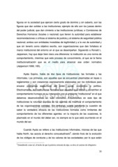 figuras en la sociedad que ejercen cierto grado de dominio y sin saberlo, son las figuras que dan solidez a las instituciones; ejemplo de ello son los jueces dentro del poder judicial, que dan cimiento a las instituciones jurídicas; o Comisiones de Derechos Humanos (locales o nacional) que tienen la autoridad para establecer recomendaciones o críticas al sistema de justicia y al sistema de seguridad pública nacional; ambos son entidades investidas de legitimidad y a la vez de autoridad y que sin tenerlo como objetivo escrito, son organizaciones que dan fortaleza al marco institucional del entorno en el que se desempeñan. Siguiendo a Ronald L. Jepperson, hay que dejar bien clara una diferencia: la institución es una norma de comportamiento, mientras que este proceso de conocimiento, al que se le llama institucionalización que es el medio para alcanzar ese orden normativo (Jepperson:1999, 195). Ayala Espino, habla de dos tipos de instituciones: las formales y las informales. Las primeras, son aquellas que se encuentran plasmadas en leyes o reglamentos y son creaciones expresamente elaboradas por los individuos para encarar problemas específicos del orden social, económico o político. Efectivamente, las instituciones formales son aquellas que limitan y constriñen el comportamiento humano en su interacción con el ambiente “institucional” en el que debemos desenvolvernos en todo momento. Encontramos en este tipo de instituciones la voluntad expresa de los agentes de modificar el comportamiento de las organizaciones sociales. Sin embargo, queda pendiente la cuestión de saber la verdadera eficacia de las instituciones formales como limitantes del comportamiento de los diferentes agentes: en la mayoría de las ocasiones, lo plasmado en el mundo del deber ser, no siempre es lo que está ocurriendo en el mundo del ser. Cuando Ayala se refiere a las instituciones informales, mismas de las que 5 habla North, las asocia al derecho consuetudinario , siendo fruto de la evolución de los códigos de conducta y de los valores de las sociedades; por lo que están 5 Entendiendo como tal, el hecho de que la práctica reiterada de algo, se eleva al carácter de obligatorio. 20