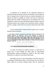 La importancia de la asimilación de las instituciones siguiendo los argumentos de estos dos autores nos parece muy importante, máxime si podemos hacer un parangón entre el individuo que ellos nos manejan, adecuándolo a las agencias del gobierno encargadas de combatir cierta clase de delincuencia, quienes tienen que asimilar, introyectar para si las instituciones que le son heredadas en el entorno social de la administración pública en México. Porque las instituciones imponen roles, conductas, usos y costumbres; sancionan y premian, incentivan y castigan al sujeto dentro de los grupos sociales (Rivas Leone, 2003: 41). El nuevo institucionalismo, pretende abordar la historia como un continuo proceso de cambio institucional: “…y que desde la división más elemental del trabajo hasta la constitución de los Estados modernos se establecen cuerpos más complejos de rutinas de comportamiento o reglas del juego que surgen para reducir la incertidumbre existente en la interacción entre los entes sociales, los cuales carecen a priori de información sobre el posible comportamiento de los otros. La repetición durante periodos prolongados de estas rutinas, constituye el mundo de las instituciones” (Romero, 1999: 18). 1.4 EL NUEVO INSTITUCIONALISMO ECONOMICO Los costos de transacción los podemos encontrar, en nuestro tema de estudio como el costo intangible que deben pagar las organizaciones gubernamentales mexicanas encargadas de combatir el narco para acopiar información en su relación con otros actores institucionales. Ayala Espino dice que el nuevo institucionalismo económico surge como una respuesta al institucionalismo clásico y al mismo tiempo, como una crítica a la rigidez analítica de la economía neoclásica (Ayala, 1999: 38). Nuevamente, 27