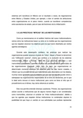 sistemas anti narcóticos en México son el resultado a veces, de negociaciones entre México y Estados Unidos, por ejemplo, o bien el cambio de atribuciones entre organizaciones en el plano interior, cuando se transfieren competencias entre secretarías de estado, para el caso del fenómeno de la militarización. 1.6 LAS PRÁCTICAS “MITICAS” DE LAS INSTITUCIONES Como ya mencionamos en el análisis histórico del nuevo institucionalismo, vemos cómo las instituciones basan su éxito en la medida que las organizaciones que las respetan alcanzan los objetivos para los que fueron diseñados por ciertos agentes estratégicos. Durante este desempeño cotidiano, las prácticas que realizan las organizaciones pueden alcanzar el grado de “mitos”. Meyer y Rowan le denominan una “mitificación racional”, misma que conlleva a la evolución de los sistemas institucionales (Meyer y Rowan, 1999: 86). Las prácticas reiteradas y casi inamovibles (costumbres), permiten explicar los comportamientos gerenciales de las organizaciones (Gagliardi, 1999: 184). Es decir, las organizaciones en determinado momento alcanzan los objetivos para los que fueron creados, e infieren que los procedimientos que implementan para alcanzarlos son los ideales, muchas veces ignorando que el problema que una vez fue resuelto puede volver a sobrepasar las organizaciones responsables de la toma de decisiones, por lo que lo ideal sería renovar el marco institucional; pero como se tiene el mito que el procedimiento es el idóneo, hay cierta reticencia al cambio. Esto nos permite entender diversas cuestiones. Primero, las organizaciones actúan acorde a instituciones que de alguna manera llegan a ser consideradas como inamovibles, alcanzan el carácter de “mitos institucionalizados”, debido a que los agentes que respetan dichas instituciones no contemplan siquiera la posibilidad de que haya un cambio en sus actividades que pudiese representar 30