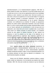 desinstitucionalización y 4) la reinstitucionalización (Jepperson, 1999: 206). La primera especie de cambio, hace referencia a lo que North también apunta como el cambio que se da en el seno de las organizaciones dentro de sus actividades cotidianas, es decir, haciendo lo que siempre hacen. Este tipo de cambio es el más común y del que nos ocuparemos en el curso de este trabajo. En la segunda forma, Jepperson entiende la continuación institucional; lo que significa la transformación de lo ya institucionalizado, tal vez sin generar “instituciones novedosas”, sino modificando las ya existentes. Por ejemplo, las agrupaciones delictivas han sufrido cambios institucionales importantes. Como dice Francoise Boyer, en su libro La guerra perdida contra las drogas, actualmente México cuenta con una “tercera” generación de narcotraficantes: la noción del gran jefe de la organización, rudo y hasta cierto punto inculto, ha quedado atrás. Lo que él llama “narco juniors” son mafiosos educados en buenas escuelas y con excelentes nociones de cómo operan los sistemas financieros, es decir, adecuan sus decisiones en razón de ambiente que les rodea; si las decisiones de su contraparte gubernamental se modernizan, ellos modernizan, igualmente, sus recursos humanos y materiales. En el tercer caso, las instituciones salen dentro de la agenda de comportamiento de las organizaciones, pero en el cuarto punto, las instituciones desinstitucionalizadas, tienen la oportunidad de volver a considerarse como pautas a seguir por las organizaciones. Como segunda premisa del cambio institucional, encontramos la desinstitucionalización y reinstitucionalización, términos que van de la mano. Representan salidas (o entradas) de formas institucionalizadas organizadas alrededor de diferentes principios o reglas. Un caso de desinstitucionalización, son las prácticas policíacas de tortura para las obtención de confesiones, o las discriminaciones de género, por ejemplo. Autores como Bo Rothstein, desentrañan cuestiones relativas a quienes pueden cambiar las instituciones o las circunstancias que propician este cambio (Rothstein, 1998: 153). Este autor concibe tres maneras en que las instituciones 35
