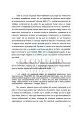 Este es una de las graves responsabilidades que juegan las instituciones en cualquier sociedad del mundo, con su “capacidad de introducir nuevas reglas de comportamiento y conducción” (Acosta, 2002: 27), e implica la construcción de múltiples combinaciones de poder, lo que podemos llamar como el “poder institucional”: la capacidad que tienen las instituciones de movilizar y transformar, así como acomodar el poder humano dentro de las organizaciones y producir una repercusión conductual en la sociedad donde se encuentran. Pensemos en la institución “elaboración de leyes” en nuestro país. Anteriormente, se consideraba como origen de las iniciativas de ley que se ventilaban en los Congresos (primordialmente el federal), la voluntad del jefe del Ejecutivo. Sin embargo, había un agente dotado de poder que era ignorado y que no hacía uso activo de dicho empoderamiento; la sociedad civil. Se gestó un cambio en el seno de la sociedad mexicana; ahora, ya no se pueden hacer leyes que alteren de frente a la sociedad, bajo la amenaza de que el Estado lidiará con la desaprobación popular, lo que genera una imagen negativa en el exterior, y que a su vez trae consecuencias de otra índole. Pero el cambio institucional en materia de seguridad pública relacionada con el narcotráfico, creemos que es explicada por Rodolfo Javier Vergara Blanco, quien al abordar el tema del cambio institucional señala: “...un intento de respuesta desde la perspectiva institucional sería argumentar que los cambios son más aparentes que sustanciales. Los ritos de la política priísta le exigían a cada nuevo presidente un rompimiento político con el anterior para verdaderamente tomar el control del país. Este rompimiento se refleja, obligadamente, en el abanico de políticas públicas que el nuevo gobierno está dispuesto a implementar”. (Vergara, 2000: 2). Otro aspecto relevante dentro del análisis del cambio institucional es el saber el ritmo al que cambian las instituciones. El problema mayor es saber que en materia de instituciones, el cambio no se percibe sino hasta que se ha dado (Díaz Pérez, 2002: 67). Para lograr determinar el ritmo con el que se modifican los marcos institucionales, se deben considerar las relaciones existentes entre las organizaciones y el ambiente que las rodea. En materia de seguridad pública, los 42