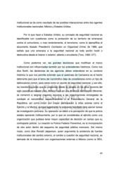 institucional se da como resultado de las posibles interacciones entre dos agentes institucionales nacionales: México y Estados Unidos. Por lo que hace a Estados Unidos, su concepto de seguridad nacional es identificable con cuestiones como la protección de su territorio de amenazas contra el comunismo, o mas recientemente, el terrorismo, como lo ejemplifica el documento titulado President’s Comission on Organized Crime, de 1986, que señala que una amenaza a la seguridad nacional es toda acción hostil o destructiva desde el interior o exterior, abierta o encubierta (Toro, 1990: 377). Como podemos ver, las grandes decisiones que modifican el marco institucional son influenciadas también por los antecedentes históricos. Como nos dice North, las decisiones de las agencias deben entenderse en su contexto histórico lo que nos permite entender que el asesinato de Camarena es el hecho detonante para que el tema del narcotráfico deje de considerarse como un tipo de delincuencia común, para verse como un asunto de seguridad nacional, y con ello, las transformaciones que se presentan desde la década de los años noventa del siglo pasado en nuestro país. México cayó en una dinámica institucional diferente: se comenzó a asignar mayores recursos a las organizaciones encargadas de combatir el narcotráfico, específicamente a la Procuraduría General de la República, así como incluir con mayor participación a otros actores como el Ejército y la Marina, aunque legalmente no estuviera facultado para ejercer tareas de investigación policíaca. Su operación se debió a la percepción de que la policía estaba operando ineficazmente, por lo que se consideraba al ejército como una organización que pudiese tener mayor capacidad de decisión en campo que su contraparte policial. La creación la Policía Federal Preventiva, es la incorporación de otro actor dentro del esquema de seguridad pública mexicano. Del mismo modo, como dice Ronald Jepperson, quien argumenta la existencia de fuentes institucionales del cambio externo, el cambio a cuestión de seguridad nacional, es derivado de la interacción con organizaciones externas a México (como la DEA, 60