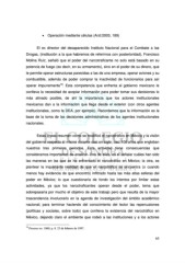 • Operación mediante células (Arzt:2003, 189) El ex director del desaparecido Instituto Nacional para el Combate a las Drogas, (institución a la que habremos de referirnos con posterioridad), Francisco Molina Ruiz, señaló que el poder del narcotraficante no solo está basado en su potencia de fuego (es decir, en su armamento), sino en el poder de su dinero, que le permite operar estructuras parecidas a las de una empresa, operar aviones y su combustible, además de poder comprar la inactividad de funcionarios para así 19 operar impunemente . Esta competencia que enfrenta el gobierno mexicano le conlleva la necesidad de acopiar información para poder tomar sus decisiones lo más atinado posible, de ahí la importancia que los actores institucionales mexicanos dan a la información que llega desde el exterior (con otros agentes institucionales, como la DEA, por ejemplo). Recordemos que la información es la base de la toma de las decisiones administrativas de los agentes institucionales nacionales. Estas líneas resumen cómo se modificó el narcotráfico en México y la visión del gobierno respecto al mismo durante casi un siglo; casi 100 años que engloban nuestros tres primeros periodos. Esta actividad tiene consecuencias que consideramos importantes de analizar. Una de ellas, es el señalar cuáles han sido las maneras en las que se ha enfrentado el narcotráfico en México; la otra, es plantear la inquietante realidad de que el narcotráfico se encuentra (o cuando menos hay evidencia de que encontró) infiltrado hasta las más altas esferas del poder en México; lo que cuestionaría de fondo los intentos por limitar estas actividades, ya que los narcotraficantes operan desde el poder, tema que sobrepasaría por mucho el objetivo de este trabajo pero que resulta de la mayor trascendencia involucrarlo en la agenda de investigación del ámbito académico nacional; para terminar haciendo del conocimiento del lector las repercusiones (políticas y sociales, sobre todo) que conlleva la existencia del narcotráfico en México, dejando claro el ambiente que rodeó a las instituciones y a los actores 19 Proceso no. 1060, p. 8. 23 de febrero de 1997. 65