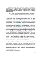 “...Por México, cada soldado arriesga su seguridad en el combate al narcotráfico. En más de 8,500 operaciones, las Fuerzas Armadas destruyeron casi 90 mil hectáreas de marihuana y amapola, decomisaron casi 40 toneladas de cocaína, inutilizaron 1,349 pistas clandestinas, y aseguraron más de 21 mil armas 25 de diversos calibres...” • El empleo del Ejército en funciones de inteligencia, investigación y persecución de delincuentes, desplazando a las policías federales. El origen de la militarización, lo ubicamos en un doble contexto derivado de la interacción de actores externos e internos a México. Por un lado, debido principalmente a la presión ejercida por Estados Unidos para influenciar a México en la toma de sus decisiones, para que las prácticas institucionales se manejase de manera similar a como se hace desde Washington, donde se le da especial preponderancia a las actividades militares en cuestiones de seguridad nacional. Por otro lado, esta presión contaba con el apoyo de la sociedad en México, que históricamente ha considerado al Ejército como una organización digna de ser recipiendaria de la confianza del Estado, derivado en gran parte de la percepción que tiene la ciudadanía de eficiencia y apoyo en labores comunitarias, como es en el caso de intervenciones en situaciones de desastre. Es decir, el Ejército ha sido empleado históricamente como una organización estatal capaz de intervenir en situaciones de crisis sociales en nuestro país. Es posible imaginar que el problema del narcotráfico representa un punto de fractura para la estabilidad nacional, entonces, el Ejército funciona como un apoyo para el Estado mexicano en la búsqueda de recuperar la estabilidad perdida, entendiendo que las prácticas mitificadas del Ejército podrán aportar soluciones a los problemas. Como dice North, las decisiones de los actores puede que se deban a la misión que se les encomienda, es decir, sus atribuciones por ley, pero también influencia poderosamente el devenir histórico que marca el ambiente en el que se desempeña dicho actor institucional. Este es otro aspecto del cambio institucional de las políticas anti narcótico en México. Sin embargo, derivado de la redefinición 25 6º. Informe de gobierno. Carlos Salinas de Gortari. 72