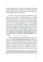 del término “seguridad nacional” y su relación con el narcotráfico, e Ejército juega un papel fundamental dentro de la defensa de los intereses de la nación ante ataques extranjeros, es por eso que el Ejército toma un papel relevante dentro de la lucha del estado mexicano frente al narcotráfico. En 1992 se creó el Centro Nacional de Drogas, (CENDRO) que fue un intento de crear una agencia con atribuciones similares a su contraparte estadounidense, la DEA, pero con una forma de operar diferente y dotada de menos capacidad de respuesta: tenía el problema de contar con equipo obsoleto, no existía una infraestructura a lo interior capaz de dotar de información confiable, (Arzt, 2003: 186). Sus atribuciones legales eran formar una red de inteligencia mexicana, capaz de conocer los modos de operación de los grupos delictivos. Esta información era distribuida directamente a la Policía Judicial Federal, quien montaba operativos basándose en informes del CENDRO. Vemos que este es un intento de cambio institucional, para crear los sistemas de inteligencia de lo que tanto adolece la infraestructura mexicana de combate al narcotráfico. Esta agencia operó hasta 1993, cuando fue sustituida por el Instituto Nacional para el Combate a las Drogas, ambos, con misión de crear servicios de inteligencia contra el narcotráfico. El problema principal para lograr la eficiencia de los esfuerzos del gobierno mexicano en su lucha contra el narcotráfico se resume en la cuestión de la 26 corrupción , las grandes cantidades de dinero que se ofrecen a los funcionarios por parte de los líderes de organizaciones criminales a cambio de protección o tolerancia de sus actividades, por lo que cualquier cambio institucional parecerá infructuoso para mejorar la eficiencia de las organizaciones. Es decir, las organizaciones delictivas saben que para su “supervivencia institucional”, es necesario comprar protección e información, es decir, adecuar el ambiente 26 Cuando el delegado de la PGR en Tijuana, general brigadier José Luis Chávez García tomó posesión del cargo, otro general asignado a la plaza de Guadalajara, Alfredo Navarro Lara viajó para entrevistarse con él, y fue el encargado de “darle el recibimiento” por parte del narco: un millón de dólares mensuales o la vida del delegado y su familia, hecho que consta por que dicha entrevista fue grabada secretamente (Fernández: 2001, 77). 73