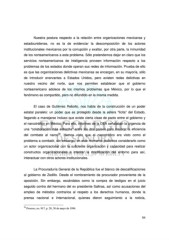 Nuestra postura respecto a la relación entre organizaciones mexicanas y estadounidense, no es la de evidenciar la descomposición de los actores institucionales mexicanos por la corrupción y exaltar, por otra parte, la inmunidad de los norteamericanos a este problema. Sólo pretendemos dejar en claro que los servicios norteamericanos de inteligencia proveen información respecto a los problemas de los estados donde operan sus redes de información. Prueba de ello es que las organizaciones delictivas mexicanas se encargan, en su mayoría, sólo de introducir enervantes a Estados Unidos, pero existen redes delictivas en nuestro vecino del norte, que nos permiten establecer que el gobierno norteamericano adolece de los mismos problemas que México, por lo que el fenómeno es compartido, pero no difundido en la misma medida. El caso de Gutiérrez Rebollo, nos habla de la construcción de un poder estatal paralelo: un poder que es protegido desde la esfera “lícita” del Estado, llegando a manejarse incluso que existe cierta clase de pacto entre el gobierno y el narcotráfico en México. Para ello, informes de la DEA señalaban la urgencia de una “colaboración más estrecha” entre los dos países para mejorar la eficiencia 38 del combate al narco . Hemos visto que el narcotráfico era visto como el problema a combatir, sin embargo, en este momento podemos considerarlo como un actor organizacional con la suficiente organización y capacidad para realizar constructos organizacionales e intentar la modificación del entorno para así, interactuar con otros actores institucionales. La Procuraduría General de la República fue el blanco de descalificaciones al gobierno de Zedillo. Desde el nombramiento de procurador proveniente de la oposición. Sin embargo, escándalos como la compra de testigos en el juicio seguido contra del hermano del ex presidente Salinas, así como acusaciones del empleo de métodos contrarios al respeto a los derechos humanos, donde la prensa nacional e internacional, quienes dieron seguimiento a la noticia, 38 Proceso, no. 917, p. 28, 30 de mayo de 1994. 84