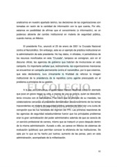 analizamos en nuestro apartado teórico, las decisiones de las organizaciones son tomadas en razón de la cantidad de información con la que cuenta, Por ello, estamos en posibilidad de afirmar que el conocimiento (o información), es un poderoso aliciente del cambio institucional en materia de seguridad pública, cuando menos, en México. El presidente Fox, anunció el 25 de enero de 2001 la Cruzada Nacional contra el Narcotráfico. Sin embargo, este es un ejemplo de práctica institucional en la administración de este presidente. No hay datos, ni oficiales, ni periodísticos de los recursos movilizados en esta “Cruzada”, tampoco se consignan, aún en el discurso oficial, las agencias de gobierno que habrían de involucrarse en esta campaña. Es importante señalar que, teóricamente, las organizaciones mexicanas se encuentran en campaña permanente contra el narcotráfico, por lo que creemos, que esta declaratoria, tuvo únicamente la finalidad de reforzar la imagen institucional de la presidencia de la república como agente preocupado en el problema a principios de su gestión. A la par, en Chihuahua, el gobernador Patricio Martínez sufrió un atentado que puso en grave riesgo su vida, a manos de una ex policía, quien se descubrió, tenía vínculos con el narcotráfico. Fue claro que al principio de su mandato, los colaboradores cercanos al presidente demostraban desconocimiento de los temas trascendentes en materia de seguridad pública, además de lidiar con una cuota de corrupción que les fue heredada del régimen del PRI. Las primeras reacciones de las agencias de seguridad estadounidense fueron que los principales problemas eran la gran centralización del poder administrativo además de que se carecía de un servicio profesional de carrera, mismo que se instauró un poco después dentro de la misma administración. Aunado a ello, se carece en México de sistemas de evaluación (públicos) que permitan conocer la eficiencia de las instituciones. Se opta por lo que se ha hecho por lustros; aumento de las penas, pero en esta administración, acompañado de la militarización. 93