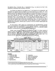 del gobierno (T 5,6), inversión (T 5,7) y exportación (T 5,10). La suma de la fila 5 (Y 5) representa la demanda total de bienes y servicios. Las fuentes de ingresos de los hogares son: 1) los factores de la producción, que distribuyen sus ingresos entre los hogares en la forma descrita por la matriz T 2,1; 2) el gobierno, que realiza transferencias a los hogares en la forma descrita por la T 2,6 y, 3) el resto del mundo, que distribuye transferencias (por ejemplo, las remesas) a los hogares en la forma descrita por T 2,10; en la parte contraria, los gastos de los hogares se distribuyen hacia: 1) las empresas, bajo la forma de pago de intereses según T 3,2; 2) las mercancías, como consumo privado (T 5,2); 3) al capital, bajo la forma de ahorro (T 7,2); y 4) al resto del mundo, bajo la forma de transferencias, (T 10,2). El resto de las filas y columnas de la MCS se lee en forma similar. Así por ejemplo, la cuenta 7 representa la igualdad ahorro-inversión, mientras que la cuenta 10 nos da la relación ingreso-gasto del resto del mundo. 10 De esta forma la MCS captura las características de interdependencia circular entre: a) la producción, b) la distribución de los ingresos factoriales, 11 c) la distribución del ingreso entre las instituciones y, particularmente, entre los diferentes grupos familiares o socioeconómicos y d) la demanda de éstos últimos. Existen varias formas de registrar las entradas en la MCS. En ciertas cuentas el asiento no tiene contrapartida 12 (transferencias) y en ocasiones se mueve en dirección opuesta (Robinson, 1989). Estos, junto con otros registros, son importantes en casos en que se examina la distribución del ingreso o macroajustes. En el cuadro núm. 2 se presenta una MCS expresada en agregados macroeconómicos (MCS AM ). Cuadro núm. 2 Cuadro núm. 2 Matriz de Contabilidad Social de agregados macroeconómicos Matriz de Contabilidad Social de agregados macroeconómicos Cuenta de Resto del Ingreso Actividades Familias Cuenta de Resto del Total Ingreso Total Actividades MercancíasMercancías Familias GobiernoGobierno capital mundo Gasto capital mundo Gasto Actividades X PIB Actividades Mercancías Mercancías C G Z E Demanda Familias Familias Y Ingreso Gobierno T h Impuestos Gobierno Cuenta de capital S h S g B Ahorro Cuenta de capital Resto del mundo M Importaciones Resto del mundo Ingreso Total doméstico Oferta Gasto Intercambio con Total el extranjero Fuente: tomado de Bracamonte (2001). Variables: Variables X = Producción (PIB) T = Impuestos h C = Producción (PIB) S = Ahorro de las familias h G = Consumo del gobierno S = Ahorro del gobierno g Z = Inversión B = Balanza comercial E = Exportaciones M = Importaciones 10 La descripción de los flujos se hace siguiendo a Barceinas y Cervini, (1993). 11 Esto es, la distribución del valor agregado generado por cada actividad de producción entre los diversos factores. 12 Es una transacción que al mismo tiempo que para unos es un gasto y para otros es un ingreso. 8