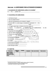 A ANEXO NÚMNEXO NÚM. 1. 1BB.CUESTIONARIO PARA ACTIVIDADES ECONOMICAS.CUESTIONARIO PARA ACTIVIDADES ECONOMICAS I. Los propietarios del establecimiento ¿radican en la localidad? I. Los propietarios del establecimiento ¿radican en la localidad? Si ( ) No ( ) ¿Dónde vive? _____________________________________ II. Características del establecimiento II. Características del establecimiento 1. Actividad principal:_____________________________________________ 2. Tipo de establecimiento: ________________________________________ 3. Años de funcionamiento de la empresa o negocio: ____________________ 4. Durante 2002-3 se realizó alguna remodelación importante: Si ( ) No ( ) Concepto: _______________________________ Costo: ________________ 5. El negocio opera bajo un sistema de servicio basado en: a) meseros b) autoservicio c) consumo fuera del establecimiento d) otro (especifique): _______________________________ 6. Capacidad del establecimiento: ____________________ 8. ¿Son los mismos del año pasado? _______________________________ 9. Volumen de ventas (unidades) en un día: __________ en la semana: _____________ al mes: ______ 10. Porcentaje de clientes: a) la localidad: _________________ b) la región : ________________ 1 c) otras partes del Estado: _______________ d) otras partes de México: _______________ e) del extranjero (EUA): _______________ III. Capital fijo III. Capital fijo Unidad de Cantidad Unidad de Cantidad Descripción Observaciones Descripción Antigüedad Valor (costo inicial) Observaciones Valor (costo inicial) Antigüedad medida medida Bienes muebles Bienes muebles 2 2 Bienes Inmuebles Bienes Inmuebles 3 3 Maquinaria/equipo Maquinaria/equipo Otros Otros 1 Hermosillo, San Pedro, El Tazajal, Estación Zamora, Estación Pesqueira 2 Terrenos/edificios/estructura física del establecimiento. 3 Automóviles, camiones de carga, motocicletas 112