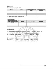 VII. Ingresos VII. Ingresos 1. Ventas: a la semana/mes/año Valor unitario (precio de Valor unitario (precio de Periodicidad de venta Periodicidad de venta Cantidad Producto Producto Cantidad venta) (sem/mes) venta) (sem/mes) 3. Ganancias estimadas durante el año: ____________________________ VIII. Existencias. VIII. Existencias. Material/producto adquirido Material/producto adquirido Precio de compra (costo Procedencia Cantidad durante 2003 que no tuvo salida Cantidad Precio de compra (costo Procedencia durante 2003 que no tuvo salida inicial) (venta) inicial) (venta) IX. Activos fijos IX. Activos fijos 1. Establecimiento/planta/local/terreno es: propio ( ) rentado ( ) otro ( ) a) si es propio: Valor estimado del local: ___________________________ b) Si es rentado: Monto del pago: ________________ mensual ( ) anual ( ) 2. El propietario es de: Comunidad ( ) región ( ) fuera del estado ( ) fuera del país ( ) 114