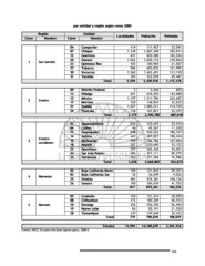 por entidad y región según censo 2000 por entidad y región según censo 2000 Región Entidad Región Entidad Viviendas Población Localidades Nombre Nombre Clave Clave Clave Nombre Clave Nombre Localidades Población Viviendas Campeche 04 04 Campeche 114 111,967 23,041 07 07 Chiapas 1,149 1,067,208 205,811 Chiapas Guerrero 12 Guerrero 837 820,280 165,254 12 Oaxaca 20 20 Oaxaca 1,062 1,042,116 218,964 1 1 Sur-sureste Sur-sureste 23 Quintana Roo 103 100,965 21,507 23 Quintana Roo 27 Tabasco 586 603,832 121,995 Tabasco 27 Veracruz 30 30 Veracruz 1,560 1,462,491 313,159 31 Yucatán 183 222,059 45,447 Yucatán 31 5,594 Total 5,594 5,430,918 1,115,178 5,430,918 1,115,178 Total 09 09 Distrito Federal 2 2,646 603 Distrito Federal Hidalgo 13 Hidalgo 691 676,453 143,988 13 15 México 1,197 1,311,796 263,687 México 15 2 2 Centro Centro 17 Morelos 17 Morelos 120 146,843 32,625 Puebla 21 Puebla 1,027 1,085,221 214,735 21 Tlaxcala 29 29 Tlaxcala 138 167,821 33,372 3,390,780 689,010 Total 3,175 3,390,780 689,010 Total 3,175 01 Aguascalientes 125 122,625 23,514 Aguascalientes 01 06 Colima 06 Colima 40 45,567 11,200 11 Guanajuato 949 920,262 180,337 Guanajuato 11 14 Jalisco 447 487,827 108,434 Jalisco 14 Centro- Centro- 16 Michoacán 3 3 16 Michoacán 759 786,786 167,004 occidente occidente 18 Nayarit 207 220,690 53,122 Nayarit 18 Querétaro 22 22 Querétaro 257 282,428 55,001 24 24 San Luis Potosí 491 451,111 89,275 San Luis Potosí 32 Zacatecas 353 351,506 76,986 32 Zacatecas 764,873 Total 3,628 3,668,802 764,873 Total 3,668,802 3,628 Baja California Norte 02 02 Baja California Norte 108 121,842 29,321 03 Baja California Sur 36 36,699 9,026 03 Baja California Sur 4 4 Noroeste Noroeste 25 Sinaloa 25 Sinaloa 483 476,381 104,126 Sonora 26 Sonora 190 184,439 41,753 26 817 Total 184,226 819,361 Total 817 819,361 184,226 05 Coahuila 120 121,314 28,059 05 Coahuila 08 Chihuahua 172 180,309 46,513 Chihuahua 08 10 Durango 5 5 Noreste 10 Durango 256 256,355 56,494 Noreste 19 Nuevo León 84 85,191 21,530 Nuevo León 19 Tamaulipas 28 28 Tamaulipas 147 147,649 35,433 790,818 Total 779 790,818 188,029 188,029 Total 779 Totales 14,100,679 Totales 13,993 14,100,679 2,941,316 13,993 2,941,316 Fuente: INEGI, Encuesta Nacional Ingreso-gasto, 2000-II. 120