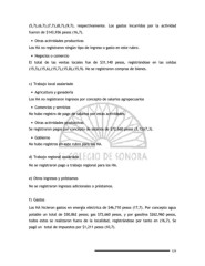 (5,7),(6,7),(7,7),(8,7),(9,7), respectivamente. Los gastos incurridos por la actividad fueron de $143,936 pesos (16,7). • Otras actividades productivas Los HA no registraron ningún tipo de ingreso o gasto en este rubro. • Negocios o comercio El total de las ventas locales fue de $31,140 pesos, registrándose en las celdas (15,5),(15,6),(15,7),(15,8),(15,9). No se registraron compras de bienes. c) Trabajo local asalariado • Agricultura y ganadería Los HA no registraron ingresos por concepto de salarios agropecuarios • Comercios y servicios No hubo registro de pago de salarios por estas actividades. • Otras actividades productivas Se registraron pagos por concepto de salarios de $72,660 pesos (3,13)(7,3). • Gobierno No hubo registros en este rubro para los HA. d) Trabajo regional asalariado No se registraron pago a trabajo regional para los HA. e) Otros ingresos y préstamos No se registraron ingresos adicionales o préstamos. f) Gastos Los HA hicieron gastos en energía eléctrica de $46,710 pesos (17,7). Por concepto agua potable un total de $50,862 pesos; gas $72,660 pesos, y por gasolina $262,960 pesos, todos estos se realizaron fuera de la localidad, registrándose por tanto en (16,7). Se pagó un total de impuestos por $1,211 pesos (10,7). 129