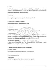 f) Gastos Los HP realizaron gastos en energía eléctrica de $6,228 pesos (17,8). Por concepto agua potable un total de $18,684 pesos y de gas $58,128 pesos, todos éstos pagaderos al resto de la región, registrándose por tanto en (16,8). g) Educación No se registraron gastos por concepto de educación para los HP. h) Construcción y material de vivienda No se anotaron gastos en estos rubros para los HP. i) Consumo • Consumo de bienes Los HP no realizaron compras de bienes duraderos en el periodo de estudio. • Gastos anuales El gasto ejercido por los HP en ropa y calzado fue de $8,650 pesos, éstos se realizaron fuera de la comunidad y por tanto se registran en (16,8). El gasto en doctor y medicinas alcanzó los $25,950 pesos, registrándose en (16,8). • Consumo de alimentos El gasto total en alimentos de los HP fue realizado dentro de la comunidad y fue de $252,580 pesos, este gasto se registró en (15,8). 5. HOGARES OTRAS ACTIVIDADES PRODUCTIVAS (HOAP) 5. HOGARES OTRAS ACTIVIDADES PRODUCTIVAS (HOAP) a) Cuentas externas No se registraron remesas ni transferencias en estos hogares. b) Actividades productivas • Agricultura Los HOAP no registraron flujo alguno en la actividad agrícola. 132