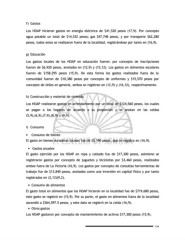 f) Gastos Los HOAP hicieron gastos en energía eléctrica de $41,520 pesos (17,9). Por concepto agua potable un total de $14,532 pesos; gas $47,748 pesos, y por transporte $62,280 pesos, todos estos se realizaron fuera de la localidad, registrándose por tanto en (16,9). g) Educación Los gastos locales de los HOAP en educación fueron: por concepto de inscripciones fueron de $6,920 pesos, anotados en (12,9) y (15,12). Los gastos en alimentos escolares fueron de $158,295 pesos (15,9). De esta forma los gastos realizados fuera de la comunidad fueron de $10,380 pesos por concepto de uniformes y $15,570 pesos por concepto de útiles en general, ambos se registran en (12,9) y (16,12), respectivamente. h) Construcción y material de vivienda Los HOAP realizaron gastos en arrendamiento por un total de $124,560 pesos, los cuales se pagan a los hogares de acuerdo a su proporción y se anotan en las celdas (5,9),(6,9),(7,9),(8,9) y (9,9). i) Consumo • Consumo de bienes El gasto en bienes duraderos locales fue de $5,190 pesos, que se registra en (16,9). • Gastos anuales El gasto ejercido por los HOAP en ropa y calzado fue de $17,300 pesos, asimismo se registraron gastos por concepto de juguetes y bicicletas por $3,460 pesos, realizados ambos fuera de La Victoria (16,9). Los gastos por concepto de consultas herramientas de trabajo fue de $13,840 pesos, anotados como una inversión en capital físico y por tanto registrados en (2,13)(9,2). • Consumo de alimentos El gasto total en alimentos que los HOAP hicieron en la localidad fue de $719,680 pesos, este gasto se registró en (15,9). Por su parte, el gasto en alimentos fuera de la localidad ascendió a $364,597.5 pesos, y este dato se registró en la celda (16,9). • Otros gastos Los HOAP gastaron por concepto de mantenimiento de activos $17,300 pesos (15,9). 134