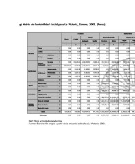 g) Matriz de Contabilidad Social para La Victoria, Sonora, 2002. (Pesos) g) Matriz de Contabilidad Social para La Victoria, Sonora, 2002. (Pesos) Factores Instituciones Factores Instituciones Capital Actividades Actividades Capital Resto del Resto de Resto de la Trabajo Hogares Asalariados Hogares No Asalariados Resto de la Resto de Resto del Total Trabajo Total Hogares No Asalariados Hogares Asalariados Región Región Mundo Mundo México México Gobierno Tierra Capital Gobierno Tierra Capital Hogar Comercio y Ahorro Hog.ar Ahorro Mixtos Agropecuarias OAP Familiar Hogar OAP Asalariado Servicios Asalariado Familiar Servicios Mixtos Hog.ar Hogar Hogar OAP Ahorro Ahorro OAP Agropecuarias Comercio y Pensionado Agropecuario Humano Agropecuario Pensionado Fisico Humano servicios Fisico servicios 1 1 2 2 3 3 4 4 5 5 6 6 7 7 8 8 9 9 10 11 12 13 14 15 16 17 18 19 10 11 15 14 19 17 18 16 13 12 Tierra 1 1 0.00 0.00 0.00 0.00 0.00 0.00 0.00 0.00 0.00 0.00 0.00 0.00 259,500.00 0.00 0.00 0.00 0.00 0.00 259,500.00 1 1 Tierra Capital 2 2 0.00 0.00 0.00 0.00 0.00 0.00 0.00 0.00 0.00 0.00 0.00 0.00 19,030.00 0.00 295,200.00 0.00 0.00 0.00 314,230.00 2 2 Capital Factores Factores Asalariado 3 3 0.00 0.00 0.00 0.00 0.00 0.00 0.00 0.00 0.00 0.00 0.00 0.00 72,660.00 1,211,346.00 12,747,942.00 0.00 0.00 0.00 14,031,948.00 3 3 Asalariado Trabajo Trabajo Familiar Familiar 4 4 0.00 0.00 0.00 0.00 0.00 0.00 0.00 0.00 0.00 0.00 0.00 0.00 0.00 0.00 411,770.00 0.00 0.00 0.00 411,770.00 4 4 Servicios Servicios 5 5 0.00 154,005.84 9,530,292.94 214,820.41 291,522.30 230,186.88 70,733.26 22,576.50 87,559.45 0.00 0.00 0.00 0.00 0.00 0.00 484,400.00 0.00 0.00 11,086,097.59 5 5 Hogares Hogares Asalariados Mixtos 6 6 259,500.00 89,858.88 4,390,681.41 125,342.79 82,920.95 90,511.44 28,767.99 6,914.05 44,830.12 1,598,520.0 0.00 0.00 0.00 0.00 0.00 2,915,179.75 0.00 0.00 9,633,027.38 6 6 Asalariados Mixtos Agropecuarios 7 7 0.00 25,652.88 91,805.81 35,782.81 0.00 12,026.96 4,269.57 0.00 10,824.26 0.00 0.00 0.00 0.00 0.00 0.00 0.00 0.00 0.00 180,362.30 7 7 Agropecuarios Instituciones Instituciones Hogares No Hogares No Pensionados 8 8 0.00 12,841.20 9,583.92 17,912.00 0.00 6,020.40 2,137.24 0.00 5,418.36 252,580.00 0.00 0.00 0.00 0.00 0.00 0.00 0.00 0.00 306,493.12 8 8 Pensionados Asalariados Asalariados OAP OAP 9 9 0.00 31,871.20 9,583.92 17,912.00 0.00 6,020.40 2,137.24 0.00 5,418.36 0.00 0.00 0.00 0.00 0.00 0.00 0.00 0.00 0.00 72,943.12 9 9 10 Gobierno 10 0.00 0.00 0.00 0.00 0.00 0.00 1,211.00 0.00 0.00 0.00 0.00 0.00 0.00 0.00 61,920.00 0.00 0.00 0.00 63,131.00 10 10 Gobierno Ahorro Físico 11 0.00 0.00 0.00 0.00 395,478.00 17,300.00 0.00 0.00 13,840.00 0.00 0.00 0.00 0.00 0.00 0.00 0.00 0.00 0.00 426,618.00 1111 11 Ahorro Físico Capital Capital Ahorro Humano 12 0.00 0.00 0.00 0.00 411,186.40 180,940.70 26,382.50 0.00 32,870.00 0.00 0.00 0.00 0.00 0.00 0.00 0.00 0.00 0.00 651,379.60 1212 Ahorro Humano 12 OAP 13 0.00 0.00 0.00 0.00 324,914.76 189,580.32 54,121.32 27,091.80 27,091.80 0.00 0.00 0.00 0.00 0.00 0.00 0.00 0.00 0.00 622,800.00 1313 OAP 13 Actividades Agropecuarias 14 0.00 0.00 0.00 0.00 0.00 0.00 0.00 0.00 0.00 0.00 0.00 0.00 0.00 0.00 0.00 0.00 0.00 0.00 0.00 14 14 Agropecuarias 14 Actividades Comercio y servicios Comercio y servicios 15 0.00 0.00 0.00 0.00 6,809,877.88 4,641,044.15 675,276.21 474,952.96 1,242,207.96 0.00 3,460.00 209,572.20 0.00 0.00 360,220.00 2,600,440.00 54,750.00 0.00 17,071,801.35 15 15 15 Resto de la Región 16 0.00 0.00 0.00 0.00 7,681,511.40 3,620,043.00 1,433,478.00 111,412.00 516,491.50 0.00 423,158.00 441,807.40 0.00 0.00 4,194,420.00 0.00 0.00 0.00 18,422,321.30 16 16 16 Resto de la Región Cuentas Cuentas Resto de México 17 0.00 0.00 0.00 0.00 547,856.40 305,691.00 46,710.00 6,228.00 41,520.00 0.00 0.00 0.00 0.00 0.00 580,440.00 0.00 0.00 0.00 1,528,445.40 1717 Resto de México 17 Externas Externas Resto del Mundo 18 0.00 0.00 0.00 0.00 0.00 0.00 0.00 0.00 0.00 0.00 0.00 0.00 0.00 0.00 0.00 0.00 0.00 0.00 0.00 18 18 18 Resto del Mundo Total 19 Total 19 259,500.0 314,230.0 14,031,948.0 411,770.0 16,545,268.09 9,299,365.24 2,345,224.34 649,175.31 2,028,071.81 1,851,100.0 426,618.0 651,379.6 351,190.0 1,211,346.0 18,651,912.0 6,000,019.75 54,750.0 0.00 2,456,686.5 19 19 Diferencias Diferencias 0.00 0.00 0.00 0.00 -5,459,170.5 333,662.14 -2,164,862.05 -342,682.19 -1,955,128.69 -1,787,969 0.00 0.00 271,610.0 -1,211,346.0 -1,580,110.65 12,422,301.55 1,473,695.4 0.00 OAP: Otras actividades productivas Fuente: Elaboración propia a partir de la encuesta aplicada a La Victoria, 2003. 145