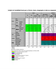 h) Matriz de Contabilidad Social para La Victoria, Sonora, desagregada en todos sus componentes 2002. (Pesos)* h) Matriz de Contabilidad Social para La Victoria, Sonora, desagregada en todos sus componentes 2002. (Pesos)* Factores Instituciones Factores Instituciones Actividades Capital Capital Actividades Resto de la Resto del Resto de Hogares No Asalariados Total Trabajo Hogares Asalariados Hogares No Asalariados Resto de la Resto de Resto del Total Hogares Asalariados Trabajo Mundo México Región Tierra Capital Gobierno Región México Mundo Gobierno Capital Tierra Hogar Hog.ar Comercio y Ahorro Ahorro Hogar OAP Familiar Asalariado Servicios Mixtos Asalariado Familiar Servicios Mixtos Hog.ar Hogar Hogar OAP Ahorro Ahorro OAP Agropecuarias Comercio y Agropecuarias OAP Agropecuario Agropecuario Pensionado Fisico Humano servicios Humano Pensionado servicios Fisico 16 10 17 15 12 13 14 1 1 2 2 3 3 4 4 5 5 6 6 7 7 8 8 9 9 10 11 12 13 14 15 16 17 18 19 18 19 11 Tierra Tierra 1 1 0.00 0.00 0.00 0.00 0.00 0.00 0.00 0.00 0.00 0.00 0.00 0.00 259,500.0 0.00 0.00 0.00 0.00 0.00 259,500.0 1 1 Capital Capital 2 2 0.00 0.00 0.00 0.00 0.00 0.00 0.00 0.00 0.00 0.00 0.00 0.00 19,030.0 0.00 295,200.0 0.00 0.00 0.00 314,230.0 2 2 Factores Factores Asalariado 3 3 0.00 0.00 0.00 0.00 0.00 0.00 0.00 0.00 0.00 0.00 0.00 0.00 72,660.0 1,211,346.0 12,747,942.0 0.00 0.00 0.00 14,031,948.0 33 Asalariado Trabajo Trabajo Familiar Familiar 4 4 0.00 0.00 0.00 0.00 0.00 0.00 0.00 0.00 0.00 0.00 0.00 0.00 0.00 0.00 411,770.0 0.00 0.00 0.00 411,770.0 4 4 Servicios Servicios 5 5 0.00 154,005.84 9,530,292.94 214,820.41 291,522.3 230,186.88 70,733.26 22,576.5 87,559.45 0.00 0.00 0.00 0.00 0.00 0.00 2,304,123.5 1,819,723.5 1,819,723.5 16,545,268.09 5 5 Hogares Hogares Asalariados Asalariados Mixtos 6 6 259,500.0 89,858.88 4,390,681.41 125,342.79 82,920.95 90,511.44 28,767.99 6,914.05 44,830.12 1,598,520.0 0.00 0.00 0.00 0.00 0.00 2,915,179.75 0.00 0.00 9,633,027.38 66 Mixtos Agropecuarios Agropecuarios 7 7 0.00 25,652.88 91,805.81 35,782.81 0.00 12,026.96 4,269.57 0.00 10,824.26 0.00 0.00 0.00 0.00 0.00 0.00 721,620.68 721,620.68 721,620.68 2,345,224.35 77 Instituciones Instituciones Hogares No Hogares No Pensionados 8 8 0.00 12,841.2 9,583.92 17,912.0 0.00 6,020.4 2,137.24 0.00 5,418.36 252,580.0 0.00 0.00 0.00 0.00 0.00 114,227.4 114,227.4 114,227.4 649,175.31 88 Pensionados Asalariados Asalariados OAP 9 9 0.00 31,871.2 9,583.92 17,912.0 0.00 6,020.4 2,137.24 0.00 5,418.36 0.00 0.00 0.00 0.00 0.00 0.00 651,709.56 651,709.56 651,709.56 2,028,071.81 99 OAP Gobierno Gobierno 10 0.00 0.00 0.00 0.00 0.00 0.00 1,211.0 0.00 0.00 0.00 0.00 0.00 0.00 0.00 61,920.0 0.00 1,787,969.0 0.00 1,851,100.0 1010 10 11 Ahorro Físico 11 0.00 0.00 0.00 0.00 395,478.00 17,300.0 0.00 0.00 13,840.0 0.00 0.00 0.00 0.00 0.00 0.00 0.00 0.00 0.00 426,618.0 1111 Ahorro Físico Capital Capital Ahorro Humano 12 0.00 0.00 0.00 0.00 411,186.4 180,940.7 26,382.5 0.00 32,870.0 0.00 0.00 0.00 0.00 0.00 0.00 0.00 0.00 0.00 651,379.6 1212 12 Ahorro Humano 13 OAP OAP 13 0.00 0.00 0.00 0.00 324,914.76 189,580.32 54,121.32 27,091.8 27,091.8 0.00 0.00 0.00 0.00 0.00 0.00 0.00 0.00 0.00 622,800.0 1313 14 Actividades Agropecuarias Actividades Agropecuarias 14 0.00 0.00 0.00 0.00 0.00 0.00 0.00 0.00 0.00 0.00 0.00 0.00 0.00 0.00 0.00 908,509.5 302,836.5 0.00 1,211,346.0 1414 15 Comercio y servicios 15 0.00 0.00 0.00 0.00 6,809,877.88 4,821,221.7 675,276.21 474,952.96 1,242,207.96 0.00 3,460.0 209,572.2 135,805.0 0.00 360,220.0 3,548,536.07 370,782.02 0.00 18,651,912.00 1515 Comercio y servicios Resto de la Región 16 0.00 0.00 0.00 0.00 7,681,511.4 3,760,181.1 1,433,478.0 111,412.0 516,491.5 0.00 423,158.0 441,807.4 135,805.0 0.00 4,194,420.0 0.00 0.00 0.00 18,698,264.40 1616 16 Resto de la Región Cuentas Cuentas Resto de México 17 0.00 0.00 0.00 0.00 547,856.4 319,037.49 46,710.0 6,228.0 41,520.0 0.00 0.00 0.00 0.00 0.00 580,440.0 5,650,768.46 0.00 0.00 7,192,560.34 1717 Resto de México 17 Externas Externas Resto del Mundo 18 Resto del Mundo 18 0.00 0.00 0.00 0.00 0.00 0.00 0.00 0.00 0.00 0.00 0.00 0.00 0.00 0.00 0.00 1,883,589.49 1,423,691.68 0.00 3,307,281.17 1818 19 Total Total 19 259,500.0 314,230.0 14,031,948.0 411,770.0 16,545,268.09 9,633,027.38 2,345,224.34 649,175.31 2,028,071.81 1,851,100.0 426,618.0 651,379.6 622,800.0 1,211,346.0 18,651,912.0 18,698,264.4 7,192,560.35 3,307,281.14 Diferencias Diferencias 0.00 0.00 0.00 0.00 0.00 0.00 0.00 0.00 0.00 0.00 0.00 0.00 0.00 0.00 0.00 0.00 0.00 0.02 * Ajustada OAP: Otras actividades productivas Fuente: Elaboración propia a partir de la encuesta aplicada a La Victoria, 2003. Matriz de Insumo Producto (MIP) Valor agregado (VA) Importaciones (MI) PIB= VA+MI Transferencias de factores a hogares Consumo de los hogares Inversión Importación de los hogares Exportaciones Remesas 146