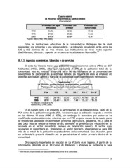 Cuadro núm.6 Cuadro núm.6 La Victoria: características habitacionales La Victoria: características habitacionales (Porcentaje) Viviendas con agua Viviendas con agua Viviendas con Viviendas con Viviendas con Viviendas con electricidad drenaje entubada drenaje electricidad entubada 1990 96.52 42.32 79.42 1995 89.00 55.00 94.40 2000 89.50 80.84 92.91 Fuente: INEGI (1990; 1995; 2000). Entre las instituciones educativas de la comunidad se distinguen dos de nivel preescolar, dos primarias y una telesecundaria. La población estudiantil oscila entre los 630 y 660 alumnos de los tres niveles. Las instituciones de nivel medio superior (bachillerato), técnicas y superior se encuentran localizadas en Hermosillo. 43 III.1.3. Aspectos económicos, laborales y de servicios III.1.3. Aspectos económicos, laborales y de servicios El ejido la Victoria tiene una población económicamente activa (PEA) de 657 habitantes (INEGI, 2000), cifra que representa el 39% de la población total de la comunidad; esto es, más de la tercera parte de los habitantes de la comunidad son susceptibles de participar en la actividad laboral. La mayoría de ellos se emplean en distintas actividades dentro y fuera de la comunidad (principalmente en Hermosillo). Cuadro núm. 7 La Victoria: población por características económicas (Participación porcentual en el total de la población) PEA PEI PO PO I* PO II* PO III* PO I* PO II* PEI PO PEA PO III* 1990 1990 31.82 36.74 31.57 22.81 43.66 33.53 2000 38.99 32.40 38.81 7.49 35.32 55.05 2000 *En relación al total de la PO Fuente: INEGI (1990; 2000). En el cuando núm. 7 se presenta la participación en la población total, tanto de la PEA como de la población ocupada (PO). Se observa que la población ocupada a crecido en los últimos 10 años (1990 al 2000), sin embargo la estructura por sector se ha modificado considerablemente: mientras que en 1990 un poco menos de la cuarta parte se encontraba laborando en actividades primarias (agricultura, ganadería, etc.), para el año 2000 esta se reduce a menos de 8%; asimismo se presenta una reducción en la ocupada en el sector secundario (aunque en proporción menor). El sector cuya ocupación es mayoritaria es, finalmente, el sector terciario, absorbiendo ya para 200 más de la mitad de la población ocupada dentro de la comunidad. Esta situación, pone en evidencia la precaria situación por la que atraviesa el sector primario dentro de la comunidad. Otro aspecto importante de rescatar en La Victoria es el ingreso. A partir de la información obtenida en el XII Censo de Población y Vivienda se evidencia la baja 43 Información proporcionada por las autoridades educativas de la comunidad. 25