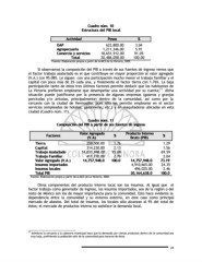 Cuadro núm. 10 Cuadro núm. 10 Estructura del PIB local Estructura del PIB local Actividad Actividad Pesos % % Pesos OAP OAP 622,800.00 3.04 Agropecuaria Agropecuaria 1,211,346.00 5.91 Comercio y servicios 18,651,912.00 91.05 Comercio y servicios Total 20,486,058.00 100.00 Total Fuente: Elaboración propia a partir de la MCS de La Victoria, 2002. Si observamos la composición del PIB a través de sus fuentes de ingreso vemos que el factor trabajo asalariado es el que contribuye en mayor proporción al valor agregado (V.A.) con 95.08%. Le siguen con una participación mucho menor el trabajo familiar y el capital con poco más de 2% cada una, y finalmente el factor tierra con 1.76%. La baja participación tanto de estos tres últimos factores permite deducir que los habitantes de La Victoria prefieren emplearse que desempeñar una actividad por su cuenta; 77 dicha situación puede justificarse por la presencia de algunas empresas (gaseras y granjas porcícolas y/o avícolas, principalmente) dentro de la comunidad, así como por la cercanía con la ciudad de Hermosillo, pues ello les permite emplearse en el sector servicios (empleados de hoteles, gasolineras, etc.) y en maquiladoras ubicadas en esta ciudad (Cuadro núm. 11). Cuadro núm. 11 Cuadro núm. 11 Composición del PIB a partir de sus fuentes de ingreso Composición del PIB a partir de sus fuentes de ingreso Valor Agregado Valor Agregado Producto Interno Producto Interno Factores Factores (V.A) % % Bruto (PIB) % % (V.A) Bruto (PIB) Tierra 259,500.00 1.76 1.29 Tierra Capital 314,230.00 2.13 1.56 Capital Trabajo Asalariado Trabajo Asalariado 14,031,948.00 95.08 69.59 Trabajo Familiar 411,770.00 2.79 2.04 Trabajo Familiar Valor Agregado (V.A.) 14,757,948.0 100.0 14,757,948.0 73.19 73.19 Valor Agregado (V.A.) 100.0 14,757,948.0 14,757,948.0 Insumos importados Insumos importados 4,910,665.00 24.35 Insumos locales Insumos locales 496,025.00 2.46 Total PIB 100.0 20,164,638.0 Total PIB 20,164,638.0 100.0 Fuente: Elaboración propia a partir de la MCS de La Victoria, 2002. Otros componentes del producto interno local son los insumos. Al igual que el factor trabajo como generador de ingreso, los insumos importados, sea de la región o del resto de México son los de mayor importancia para la comunidad. Esto hace evidente la dependencia entre la comunidad y su entorno externo, en este caso como principal mercado de abastos. Del total de insumos, los locales sólo alcanzan al 9% del total de éstos; el mercado de productos interno no satisface la demanda local. 77 Asimismo la cercanía a la cabecera municipal hace que la demanda por ciertos productos dentro de la comunidad sea muy baja, prefiriendo la población salir de la comunidad para hacerse de éstos. 41