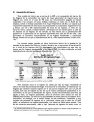 b)) Composición del IngresoComposición del Ingreso b Otra variable de interés que se deriva de la MCS es la composición del ingreso de los hogares de la comunidad. Los rubros de mayor generación de ingresos para los hogares son, como en el caso de PIB local, las remuneraciones pagadas al trabajo asalariado y las remesas. El factor trabajo contribuye en total con el 48.3% de los ingresos, siendo el trabajo asalariado el de mayor importancia (46.8%). Los hogares que mayormente dependen de este factor son propiamente los asalariados: Hogares Servicios y Mixtos, con 60 y 48% respectivamente del total de sus ingresos. El resto de los factores: tierra, capital y trabajo familiar contribuyen con una mínima parte al total de los ingresos de los hogares. En ese sentido, es más notoria aún la participación del gobierno en la generación de los ingresos, aportando poco más del 6% del total. Este porcentaje se concentra exclusivamente en los hogares Pensionados y Asalariados Mixtos, mismos en los que su importancia es del 40 y 18% respectivamente (Cuadro núm. 15). 78 Las remesas juegan también un papel importante dentro de la generación de ingresos de los hogares del Ejido La Victoria. Destacan por el porcentaje de participación en el total de los ingresos (44.51%). Los hogares más beneficiados con este tipo de apoyos son los hogares agropecuarios y los hogares OAP, los datos evidencian su total dependencia de este tipo de ingresos (Cuadro núm. 12). Cuadro núm.12 Cuadro núm.12 Distribución del ingreso por hogar Distribución del ingreso por hogar Proporción por Ingreso Ingreso Ingreso Proporción por Población Ingreso Población Hogar Hogar (Pesos) tipo de hogar Total* per cápita tipo de hogar per cápita Total* (Pesos) (%) (Pesos/año) (%) (Pesos/año) HAS 16,545,268.09 52.17% 879 18,821.45 HAS HAMx 9,633,027.38 30.44% 513 18,780.98 HAMx HA HA 2,345,224.35 8.69% 146 16,016.39 HP 649,175.31 4.35% 73 8,856.72 HP HOAP HOAP 2,028,071.81 4.35% 73 27,669.04 1,685.00 100.00% 18,516.78 Total Total 31,200,766.93 100.00% 1,685.00 18,516.78 31,200,766.93 * INEGI (2000). Fuente: Elaboración propia a partir de la MCS de La Victoria, 2002. Otro indicador clave es el ingreso per cápita por tipo de hogar. Realizando el cálculo a través del porcentaje del hogar en el total de la comunidad, se observa que los hogares que obtienen mayores ingresos en el año son los hogares OAP, con $27,669.04 anuales; este tipo de hogares es uno de los de menor participación poblacional en la comunidad, de ahí que la distribución del ingreso resulte más beneficiosa para ellos. Le siguen a éstos, los hogares asalariados, tanto de servicios como mixtos con más de $18,000 pesos anuales. Los HAS son los que absorben la mayor parte de los ingresos de la comunidad, sin embargo, son al mismo tiempo los más numerosos. Finalmente y muy alejados del promedio de ingresos de la comunidad, mismo que se ubicó en $18,500 pesos, se encuentran los hogares pensionados, con menos de $9000 pesos anuales. Esta es una situación preocupante, pues la baja captación de ingresos los señala como un 78 Las remuneraciones hechas por el sector gobierno a estos hogares se refiere en su mayoría al pago de pensiones y/o jubilaciones a trabajadores de la comunidad, o bien al otorgamiento de becas. 42