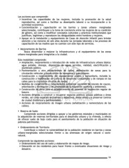 Las acciones que comprende: Ø Incentivar las capacidades de las mujeres, incluida la promoción de la salud reproductiva, así como a facilitar su desempeño laboral o su incorporación a la actividad económica. Ø Concientización y capacitación en los barrios y zonas urbano- marginadas seleccionadas, contribuyan a la toma de conciencia entre las mujeres de su condición de género, así como a modificar conceptos culturales y prácticas institucionales que justifican, legitiman y reproducen las desigualdades entre hombres y mujeres. Ø Apoyar en la instalación y equipamiento de Casas de Atención Infantil para brindar atención a los menores de seis años durante las jornadas laborales o los procesos de capacitación de las madres que no cuentan con este tipo de servicios. § Mejoramiento de Barrios Busca desarrollar o mejorar la infraestructura y el equipamiento de las zonas urbano-marginadas para integrarlas a la ciudad. Esta modalidad comprende: Ø Ampliación, mejoramiento o introducción de redes de infraestructura urbana básica: agua potable, drenaje, disposición de aguas servidas, vialidad, electrificación y alumbrado público. Ø Pavimentación u otro recubrimiento de calles, delimitación de zonas para la circulación vehicular y construcción de banquetas y guarniciones. Ø Construcción o mejoramiento del equipamiento urbano y comunitario, incluida la construcción o habilitación de Centros de Desarrollo Comunitario y de rampas en las calles para la circulación en sillas de ruedas. Ø Medidas de conservación o mejoramiento ambiental (acciones de rescate de cauces, arborización y forestación y de promoción de la educación sanitaria y ambiental). Ø Construcción de obras para el establecimiento de sistemas de recolección regular de basura. Ø Acciones dirigidas a construir o recuperar espacios públicos (plazas públicas y áreas verdes, así como espacios recreativos y deportivos, entre otros) y a preservar centros de ciudad (históricos y patrimoniales). Ø Acciones de mejoramiento de imagen urbana (señalización y nomenclatura de las calles). § Reserva de Suelo Comprende acciones dirigidas a apoyar a los gobiernos estatales y municipales en la adquisición de reservas territoriales para el desarrollo urbano y la vivienda, a efecto de ofrecer suelo de bajo costo para el asentamiento de la población en situación de pobreza patrimonial. § Ordenamiento de Territorio Contribuye a reducir la vulnerabilidad de la población residente en barrios y zonas urbano-marginadas seleccionadas frente a las amenazas de origen natural o socio- natural. Comprende las siguientes acciones: Ø Ordenamiento del uso de suelo y elaboración de mapas de riesgo. Ø Educación en los residentes para hacer frente a eventuales situaciones de riesgo y desastre. 54