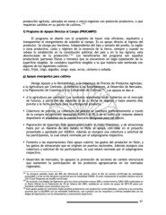 producción agrícola, ubicados en zonas o micro-regiones con potencial productivo, o que requieran cambios en su patrón de cultivos. 103 f) Programa de Apoyos Directos al Campo (PROCAMPO) f) Programa de Apoyos Directos al Campo (PROCAMPO) El programa se diseñó con el propósito de hacer más eficiente, equitativo y transparente el otorgamiento de subsidio al campo. Es un apoyo directo al ingreso del productor. Se otorga por hectárea, independiente del tipo y tamaño del predio, la región o zona productiva, costo y régimen de la tenencia de la tierra, siempre y cuando no rebase lo establecido en la constitución políticas del país y en la ley Agraria; esta desvinculado de la producción. 104 Los beneficiarios del programa son aquellos productores (personas físicas o morales) que se encuentran en legal explotación de la superficie elegible. Se considera superficie elegible a la que hubiera sido sembrada con algunos de los siguientes cultivos: maíz, fríjol, trigo, algodón, sorgo, soya, arroz, cártamo o cebada. g) Apoyos emergentes para cultivos g) Apoyos emergentes para cultivos Otorga Apoyos a la Rentabilidad, a la Cobertura de Precios de Productos Agrícolas, a la Agricultura por Contrato, Al fomento a las Exportaciones, al Desarrollo de Mercados, a la Pignoración de Cosechas y a la Conversión de Cultivos. 105 Los apoyos se dan a: § A la agricultura por contrato; Los contratos registrados serán cubiertos en el mercado de futuros; a partir del día siguiente al de su fecha de registro y hasta sesenta días previos a la fecha pactada para la entrega del producto. § Cobertura de precios;; La cobertura de precios se realizará preferentemente a través de la compra de opciones; aportando ASERCA el 50 % de su costo y el restante deberá depositarlo el productor en la cuenta bancaria designada para tal efecto. § Pignoración de cosechas; Este apoyo podrá cubrir el costo financiero, y de almacenaje hasta por un máximo de seis meses; el flete se apoya, con base en el proyecto presentado y aprobado por ASERCA. Además se otorgará una cobertura a solicitud de los participantes, la cual estará normada por el subprograma respectivo. § Fomento a las exportaciones; Este apoyo cubrirá; los gastos del productor en flete, y los gastos de almacenaje que se originen en puertos nacionales. Además otorgara una cobertura a solicitud de los participantes, la cual estará normada por el subprograma respectivo. § Desarrollo de mercados; Se apoyara la promoción de acciones de cambio estructural que aumenten la participación de los productos agropecuarios en los mercados regionales. 103 Se otorgará subsidio hasta del 80% del diferencial del precio, entre el kilo de semilla certificada de variedades mejoradas y el de un kilo de grano comercial para la modalidad PADER. En este componente el subsidio máximo será de $24.75 por kilogramo de semilla certificada. 104 De acuerdo a las Reglas de Operación para los ciclos primavera-verano 2002 y otoño-invierno 2002/2003 publicados en el Diario Oficial de la Federación de 18 de febrero del 2002, establecen un monto de apoyo de $873.00 pesos por hectárea cultivable (www.procampo.org.mx). 105 Este apoyo puede ser solicitarlo todos aquellos productores con producción comercializable, conforme a los convenios suscritos por la SAGARPA con las entidades federativas, que cumplan con los requisitos y criterios establecidos (en las Reglas de Operación) y en los lineamientos y mecanismos específicos. 57