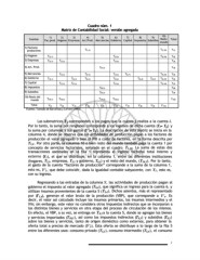 Cuadro núm. 1 Cuadro núm. 1 Matriz de Contabilidad Social: versión agregada Matriz de Contabilidad Social: versión agregada 1) 2) 3) 4) 5) 6) 7) 8) 9) 10) Cuentas Fac.prod. Hogares Empresas Act.Prod. Mercancías Gobierno Capital Impuestos Subsidios Resto Total mundo 1) Factores productivos T (1,4) T (1,10) Y (1) 2) Hogares T (2,1) T (2,6) T (2,10) Y (2) 3) Empresas T (3,1) T (3,2) T (3,6) Y (3) 4) Act. Prod. T (4,5) Y (4) 5) Mercancías T (5,2) T (5,4) T (5,6) T (5,7) T (5,10) Y (5) 6) Gobierno T (6,1) T (6,3) T (6,4) T (6,6) T (6,8) T (6,9) T (6,10) Y (6) 7) Capital T (7,2) T (7,3) T (7,6) T (7,10) Y (7) 8) Impuestos T (8,5) Y (8) 9) Subsidios T (9,5) Y (9) 10) Resto del mundo T (10,1) T (10,2) T (10,5) T (10,6) Y (10) Total Y' (1) Y' (2) Y' (3) Y' (4) Y' (5) Y' (6) Y' (7) Y' (8) Y' (9) Y' (10) Fuente: Tomado de Barceinas y Cervini (1993) Las submatrices T ij corresponden a los pagos que la cuenta j realiza a la cuenta i. Por lo tanto, la suma por renglones corresponde a los ingresos de dicha cuenta (Y i= = Y ij) y la suma por columnas a sus gastos (Y’ i= = Y ij). La descripción de esta matriz se inicia en la columna 4, donde se observa que las actividades de producción pagan a los factores de producción el valor agregado o bien el PIB a costo de factores, en la forma descrita por T 1,4. Por otra parte, la columna 10 o bien resto del mundo también paga la cuenta 1 por concepto de servicios factoriales, señalado en el cuadro T 1,10. La suma de estas dos transacciones asentadas en la fila 1 representa el ingreso factorial total interno y externo (Y 1), el que se distribuye, en la columna 1, entre las diferentes instituciones (hogares, T 2,1, empresas, T 3,1 y gobierno, T 6,1) y el resto del mundo, (T 10,1). Por lo tanto, el gasto de la cuenta “factores de producción” corresponde a la suma de la columna 1, esto es, Y’ 1, que debe coincidir, dada la igualdad contable subyacente, con Y 1, esto es, con su ingreso. Regresando a las entradas de la columna Y, las actividades de producción pagan al gobierno el impuesto al valor agregado (T 6,4), que significa un ingreso para la cuenta 6, y utilizan insumos provenientes de la cuenta 5 (T 5,4). Dichos asientos, más el representado por (T 1,4), generan el valor bruto de la producción (VBP), que corresponde a Y’ 4. Es decir, el valor así calculado incluye los insumos primarios, los insumos intermedios y el IVA; sin embargo, este valor no considera otros impuestos indirectos que se incorporan a los distintos bienes y servicios en otra etapa del proceso de circulación de los mismos. En efecto, el VBP, a su vez, se entrega en T 4,5 a la cuenta 5, donde se agregan los bienes y servicios importados (T 10,5), así como los impuestos indirectos (T 8,5) y subsidios (T 9,5) sobre los bienes y servicios, tanto de origen doméstico como externos, para obtener la oferta total a precios de mercado (Y’ 5). Esta oferta se distribuye a lo largo de la fila 5 entre los diferentes usos: consumo privado (T 5,2), consumo intermedio (T 5,4), el consumo 7