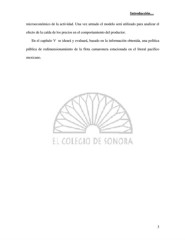 Introducción.... microeconómico de la actividad. Una vez armado el modelo será utilizado para analizar el efecto de la caída de los precios en el comportamiento del productor. En el capítulo V se ideará y evaluará, basado en la información obtenida, una política pública de redimensionamiento de la flota camaronera estacionada en el litoral pacifico mexicano. 3
