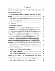 Índice general. Capítulo I. Introducción................................................................................ 1 1.1. Aspectos biológicos relevantes de la especie camarón de alta mar en 4 el litoral del Pacifico mexicano.........………………………………………… 1.2. La pesquería del camarón de alta mar en el litoral del Pacifico mexicano……………………………………………………………………… 6 1.2.1 Artes de pesca y puertos pesqueros……………………………... 6 1.2.2. El mercado y los precios………………………………………… 8 1.3. Planteamiento del problema................................................................. 12 1.4. Justificación.......................................................................................... 14 1.5. Preguntas de investigación..................................................................... 15 1.6. Hipótesis................................................................................................. 15 1.7. Objetivos............................................................................................... 16 1.8. Metodología........................................................................................... 16 Capítulo II. Marco explicativo........................................................................ 18 2.1. Elección racional y sobrecapitalización………………………………… 18 2.2 Nuevo institucionalismo económico y sobrecapitalización....................... 21 2.3 Los efectos de la sobrecapitalización en una temporada de pesca: el modelo de competencia perfecta y la maximización de los beneficios en el 25 corto plazo……………………………………………………………………. 2.3.1. Efectos de la sobrecapitalización en el corto plazo…………… 25 2.3.2. El mercado de competencia perfecta y la maximización de los 26 beneficios en el corto plazo………………………………………………. 2.4. El análisis costo – beneficio y políticas públicas................................. 31 2.4.1. El valor actual neto……………………………………………… 33 2.4.2. La tasa interna de retorno………………………………………. 34 Capítulo III. El estado y la sobrecapitalización: un enfoque 36 institucionalista................................................................................................. 3.1 Etapa de apropiación de los recursos pesqueros (1917-1949) ................ 37 3.2. Etapa de fomento de la actividad pesquera (1950 – 1981) ..................... 39