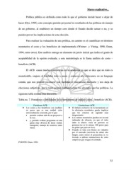 Marco explicativo... Política pública es definida como todo lo que el gobierno decide hacer o dejar de hacer (Dye, 1995), este concepto permite proyectar los resultados de las políticas de manejo de un gobierno, al establecer un tiempo cero donde el Estado decide actuar o no, y se pueden prever las implicaciones de esta elección. Para realizar la evaluación de una política, un camino es el cuantificar en términos monetarios el costo y los beneficios de implementarla (Weimer y Vining, 1998; Dunn, 1994; entre otros). Este análisis entrega un elemento de juicio inicial que indica el grado de aceptabilidad de la opción evaluada; a esta metodología se le llama análisis de costo – beneficio (ACB). El ACB causa mucha controversia en la academia ya que se dice que no todo es monetizable, empero el trasladar todo a pesos y centavos nos colocamos en un lenguaje común, que nos permite reconocer con facilidad el mecanismo decisorio y nos aleja de elecciones subjetivas, por lo tanto genera confianza entre los afectados por las políticas. La siguiente tabla resume esta discusión. Tabla no. 7. Fortalezas y debilidades de la herramienta de análisis costo – beneficio (ACB). Fortalezas ACB Limitaciones ACB Los costos y los beneficios son medidos El énfasis exclusivo de la herramienta en en pesos que es una unidad valor la eficiencia económica puede implicar universalmente conocida, por lo que: que los criterios de equidad sean • permite evaluar más de un proyecto a despreciados. la vez; Los valores monetarios pueden ser un mal • y, permite evaluar programas en una indicador de eficacia, ya que el valor gama muy diversa de áreas (salud, dado al dinero varia de persona en transporte, manejo de recursos, entre persona (no es lo mismo 100 pesos para otras). un pobre que para un rico). Cuando se trata con bienes no valuados por el mercado (servicios de salud, aire limpio, entre otros) el proyectista se ve forzado a utilizar estimaciones de valor subjetivas que sesgan el resultado. FUENTE: Dunn, 1994. 32